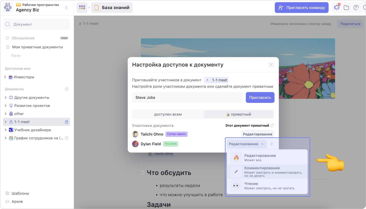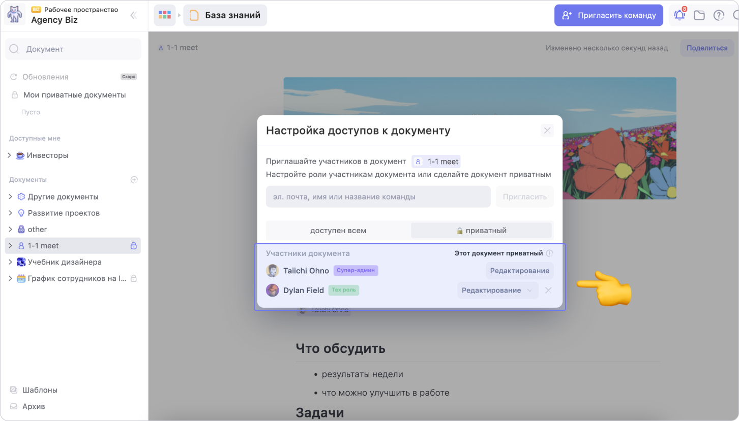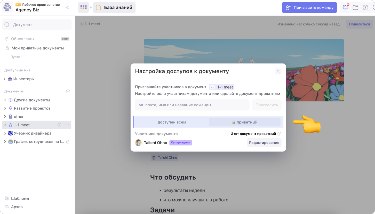 По умолчанию все участники рабочего пространства имеют доступ ко всем публичным документам. Чтобы ограничить доступ к определённому документу, можно сделать его приватным или ограничить права участников