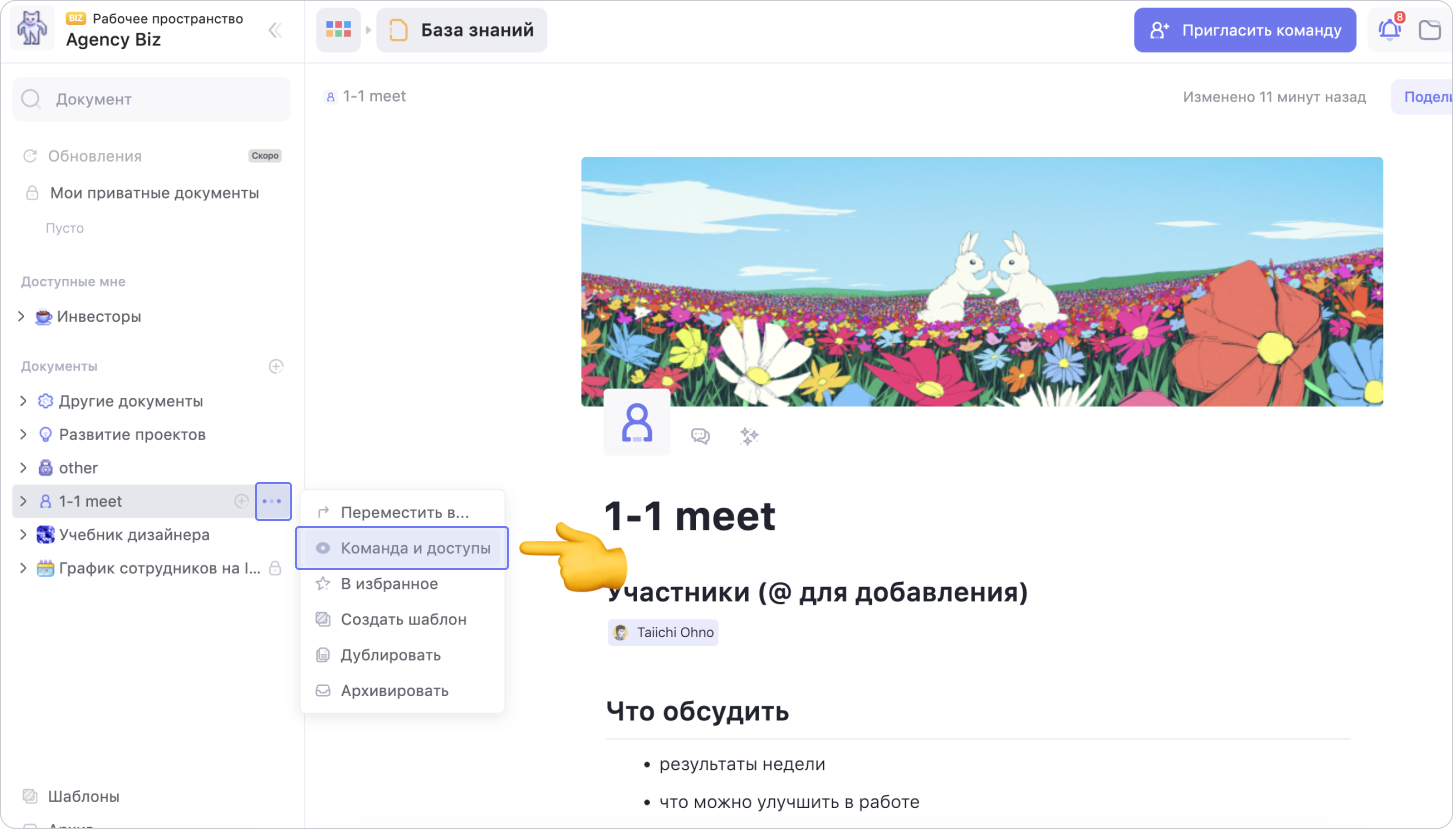 Чтобы сделать документ приватным, нажми на три точки справа от его названия на боковой панели. Выбери пункт Команда и доступы