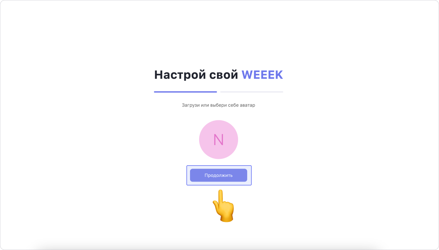 Ответь на пару вопросов, которые помогут нам сделать Weeek удобным для тебя, выбери аватар и оформление рабочего пространства. На каждом шаге для подтверждения нажимай Продолжить