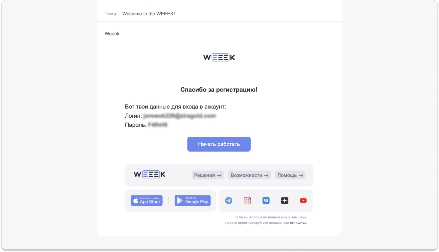 Нажми на кнопку Начать работать, чтобы перейти в Weeek. Введи полученные логин и пароль для входа