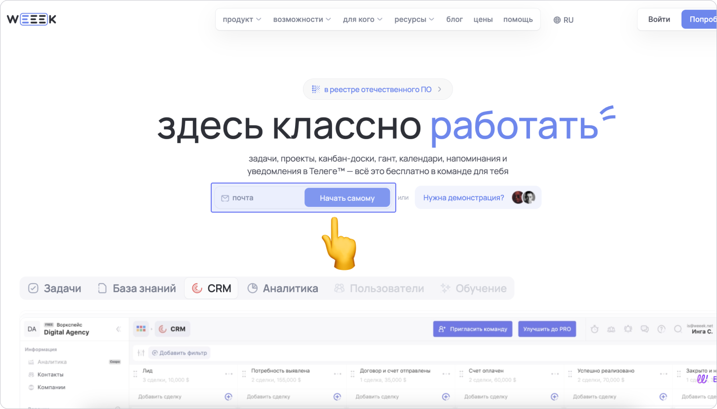 Чтобы самостоятельно создать аккаунт, перейди на главную страницу Weeek, введи свой e-mail в поле почта, а затем нажми на кнопку Начать самому