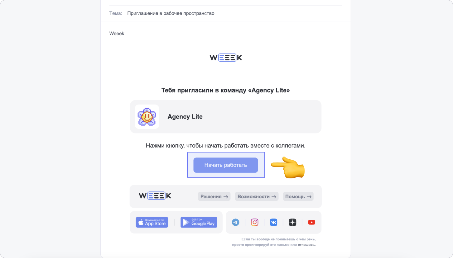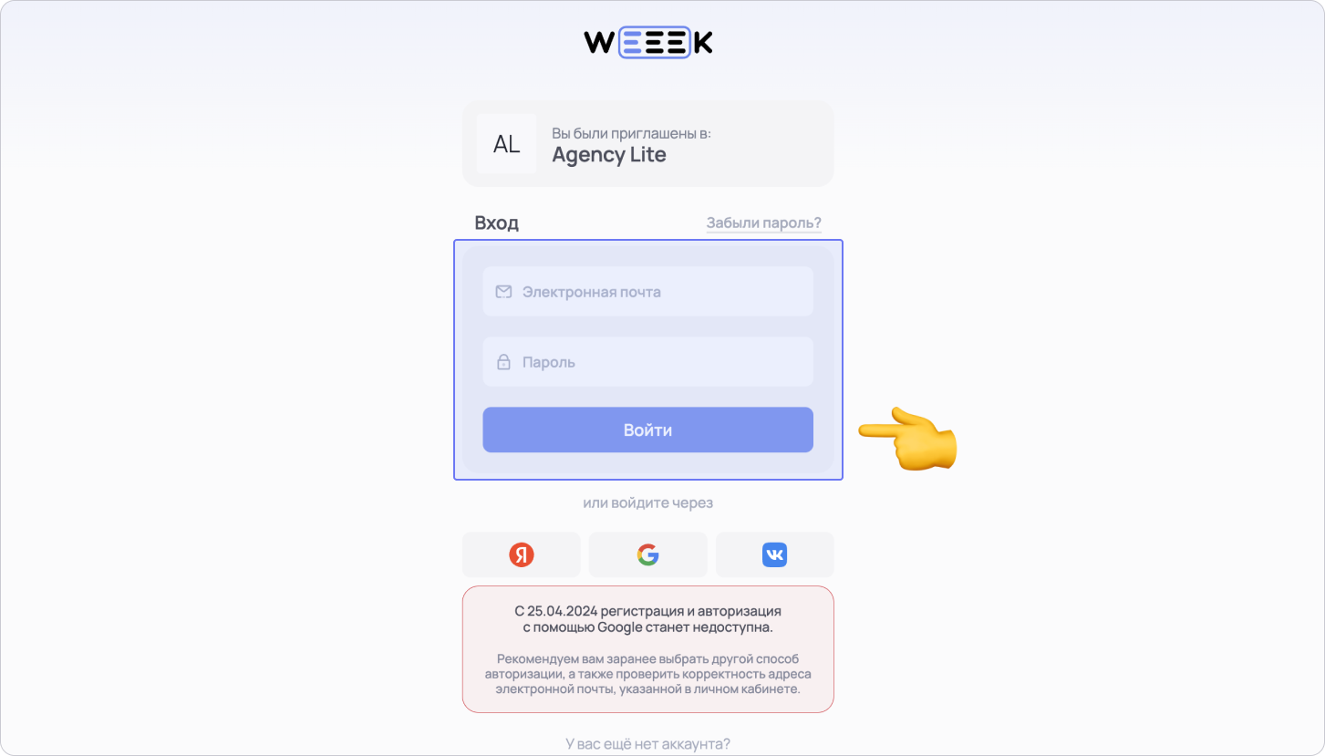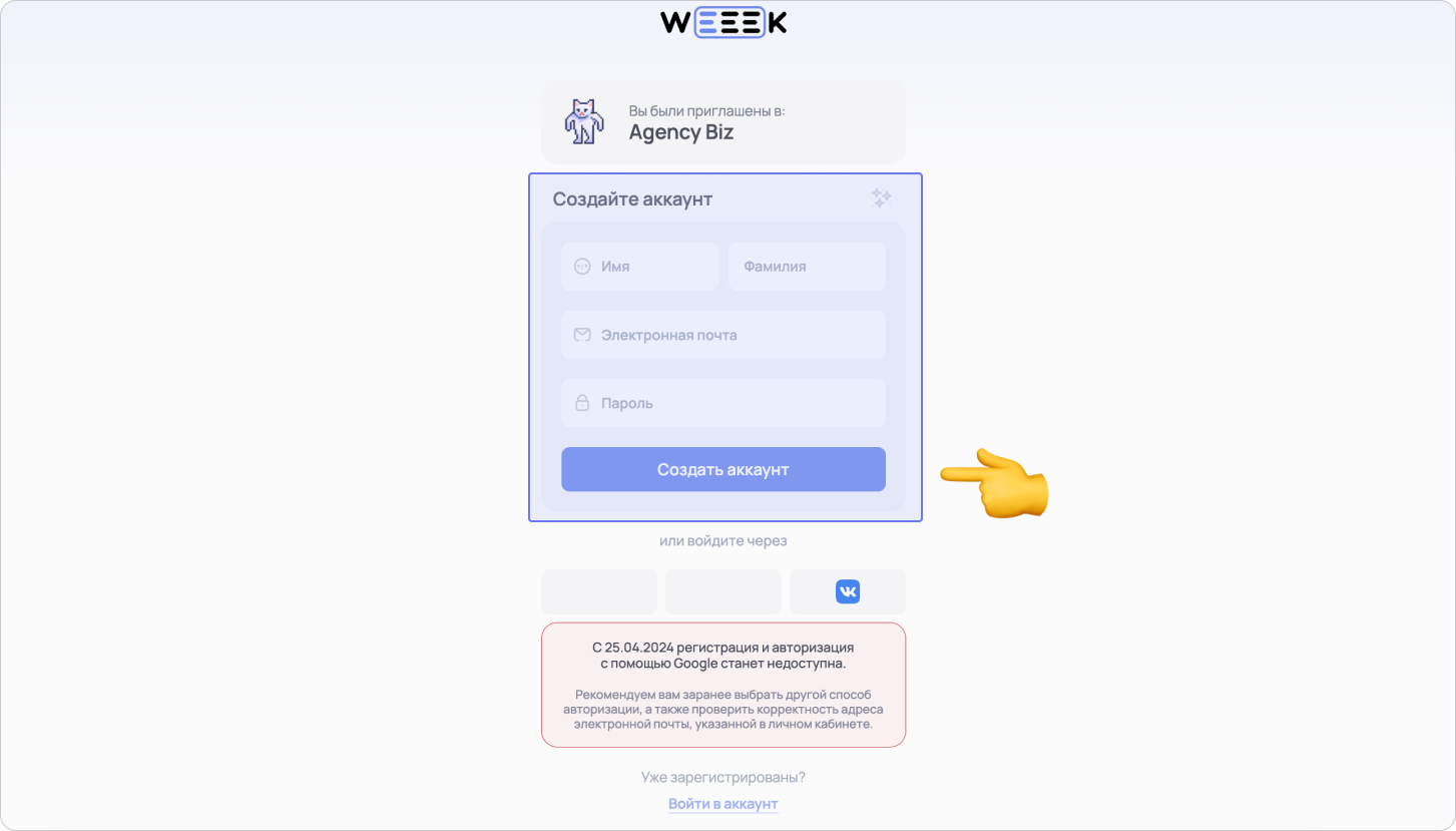 Если тебя пригласили в Weeek по ссылке-приглашению, перейди по ней, заполни форму и нажми на кнопку Создать аккаунт или войди с помощью социальных сетей