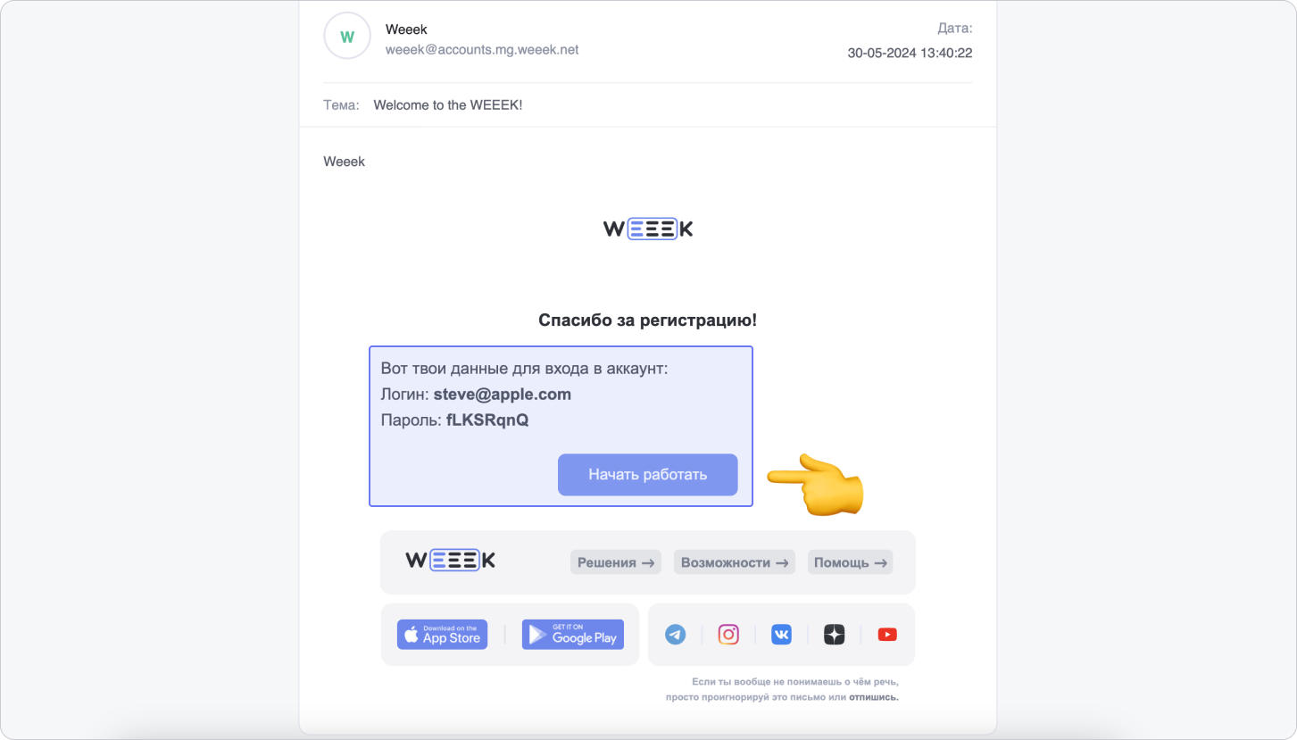 На указанную почту придёт письмо с логином и паролем для входа. Нажми на кнопку Начать работать