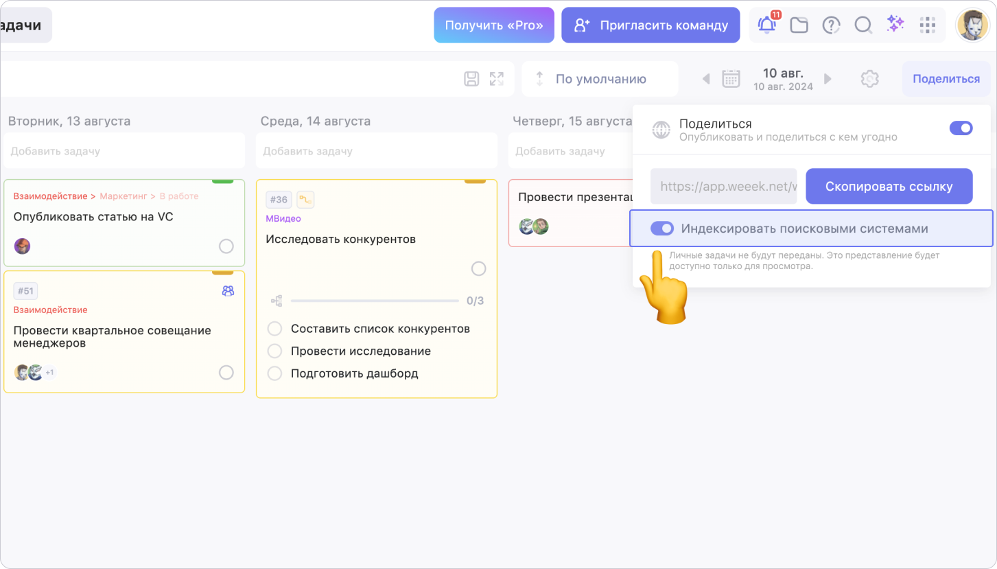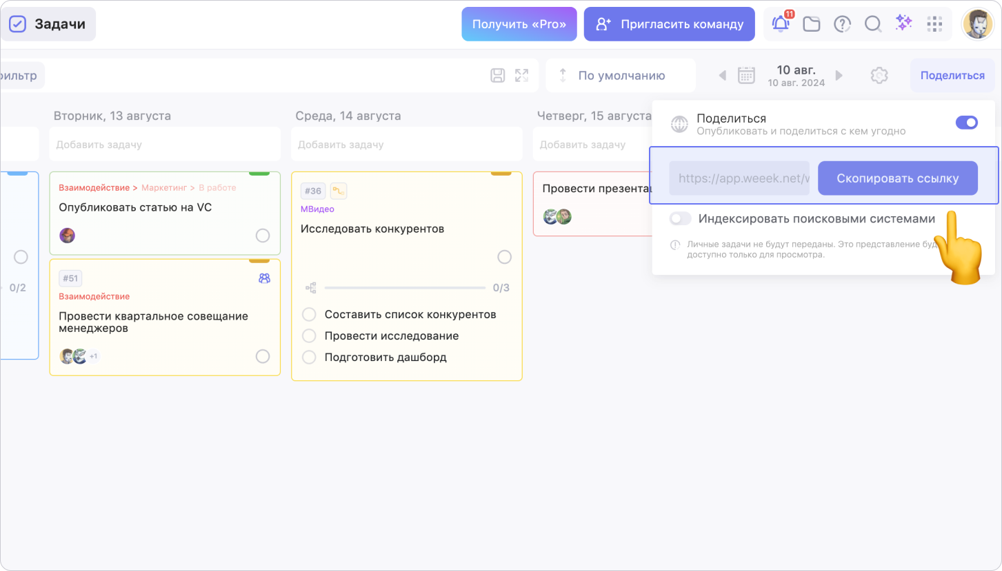 Функция пригодится, чтобы показать статус проекта заказчику, поделиться кейсом организации рабочего пространства с коллегами — и для всех случаев, когда нужно показать пространство Weeek людям, которые не зарегистрированы в нашем сервисе