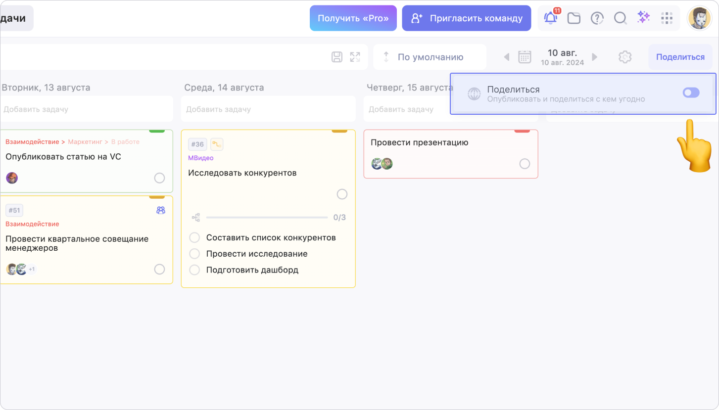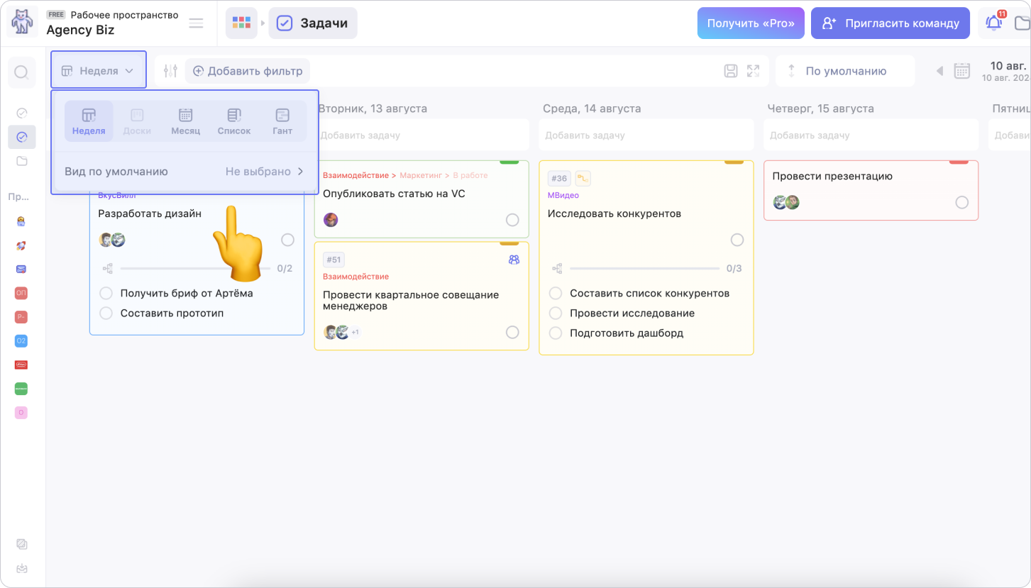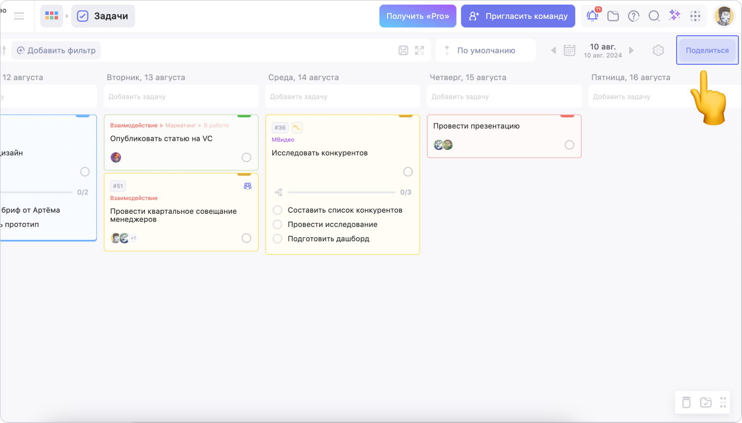 Чтобы поделиться рабочим пространством и задачами, выбери нужный режим просмотра Неделя, Месяц, Доски или Список. Для этого нажми на меню режимов просмотра и выбери режим просмотра
