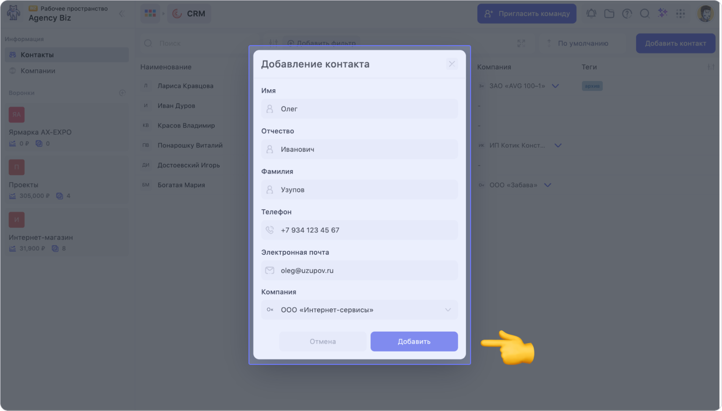 В модальном окне введи данные контакта: имя, телефон, электронную почту и выбери компанию контакта