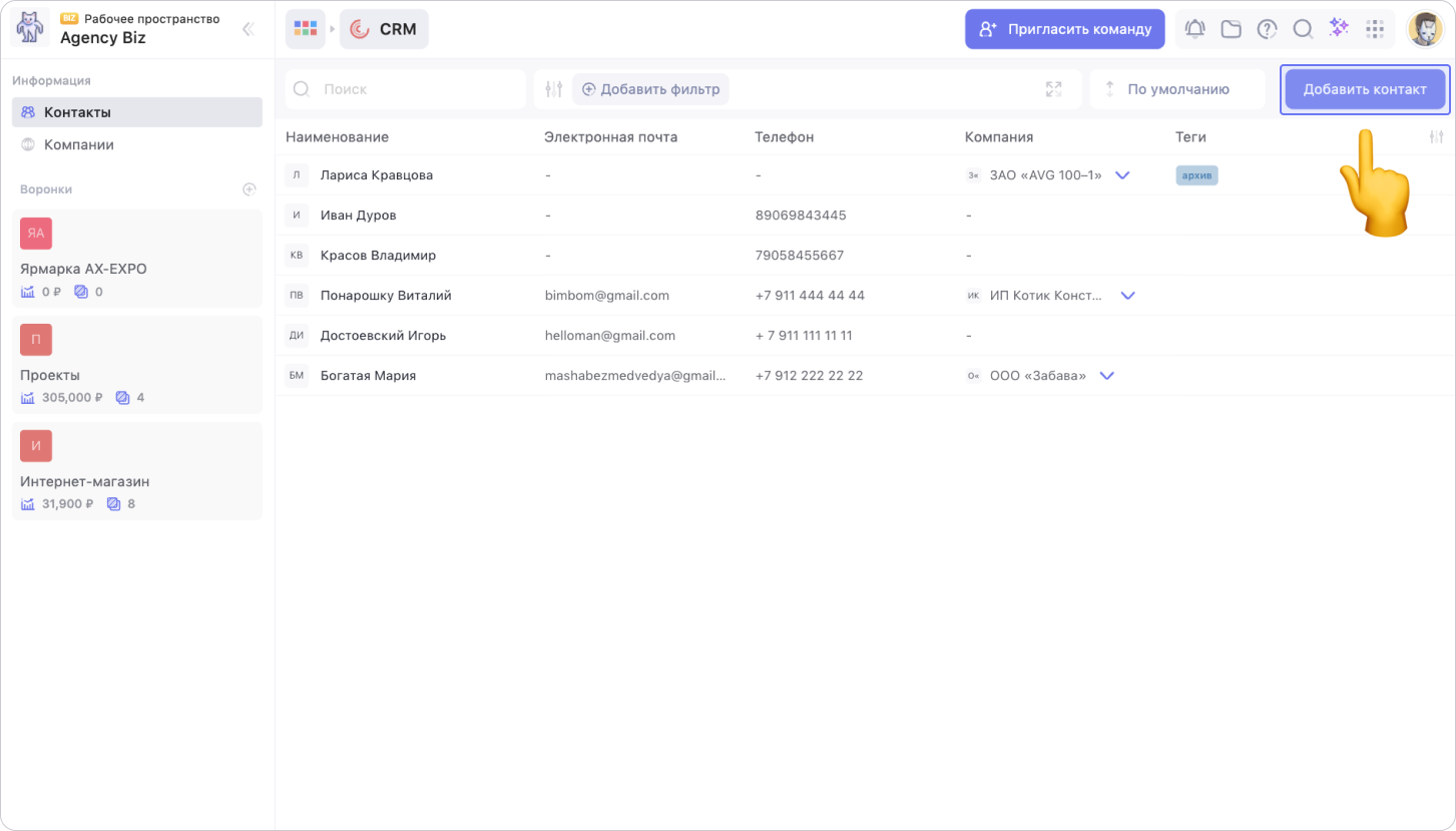 Чтобы создать новый контакт, перейди в раздел и нажми на кнопку Добавить контакт