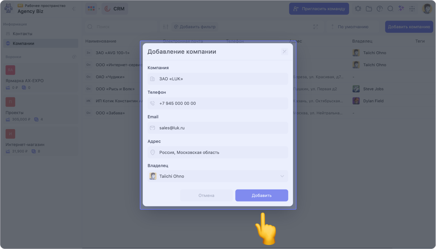 В модальном окне введи данные организации: название, телефон, электронную почту и адрес. А также выбери владельца из участников рабочего пространства