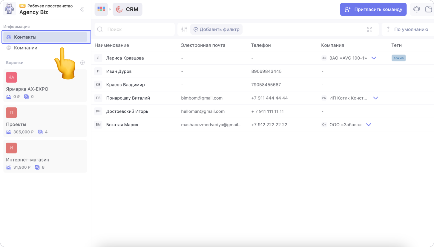В сервисе CRM ты можешь создать базы контактов клиентов и компаний. Они располагаются на боковой панели слева