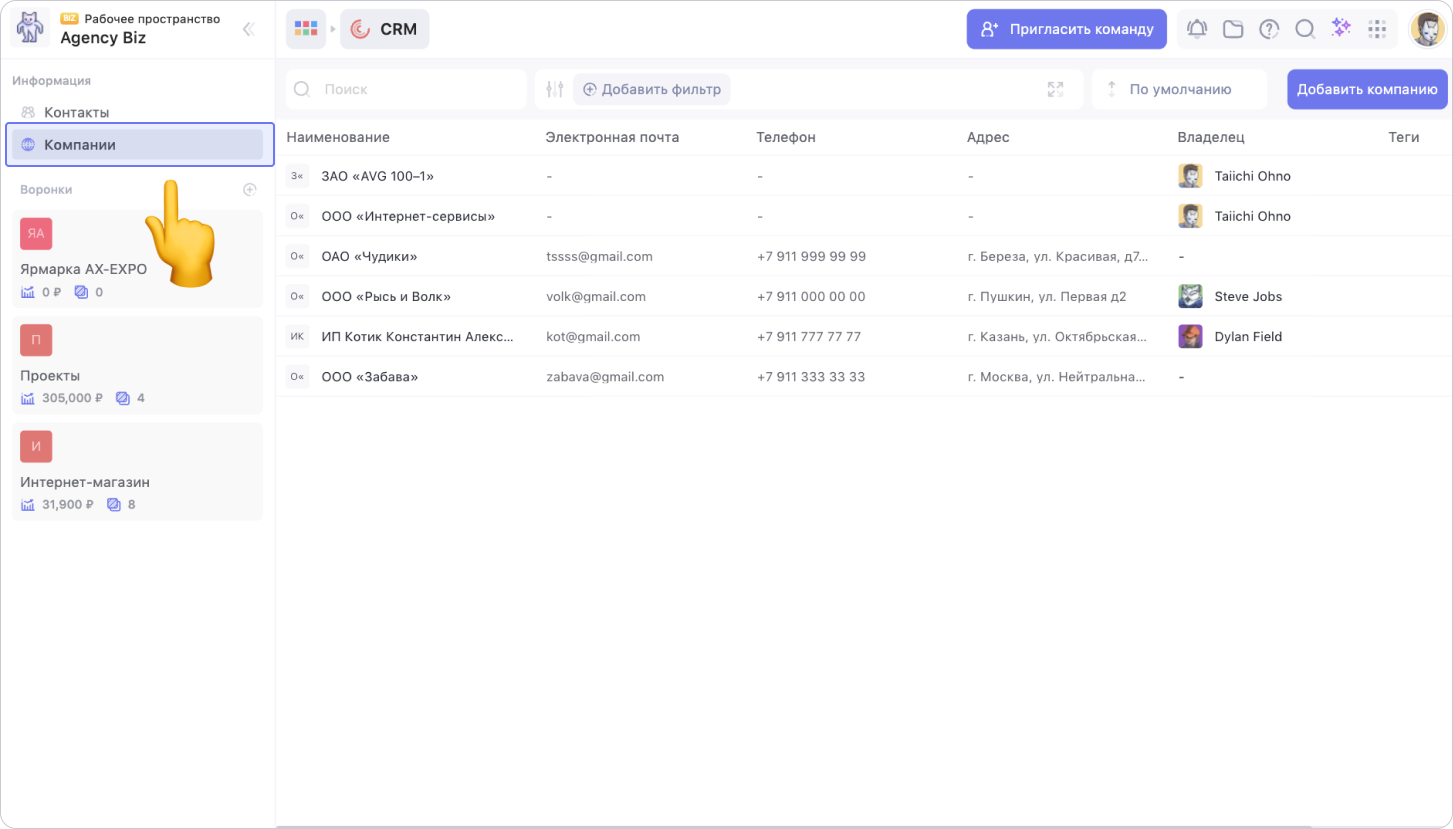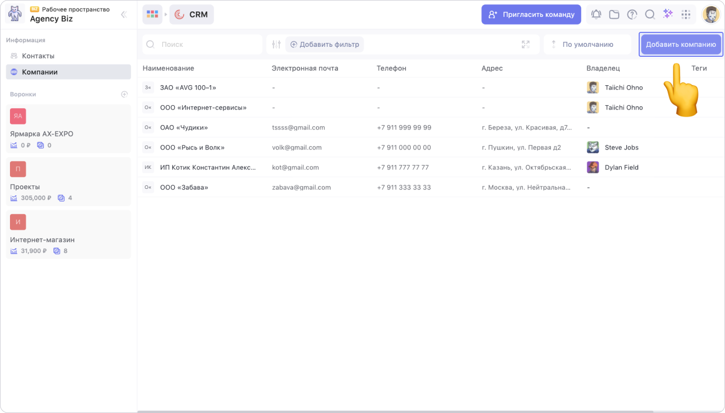 Чтобы добавить контакт организации, перейди в раздел Компании и нажми на кнопку Добавить компанию