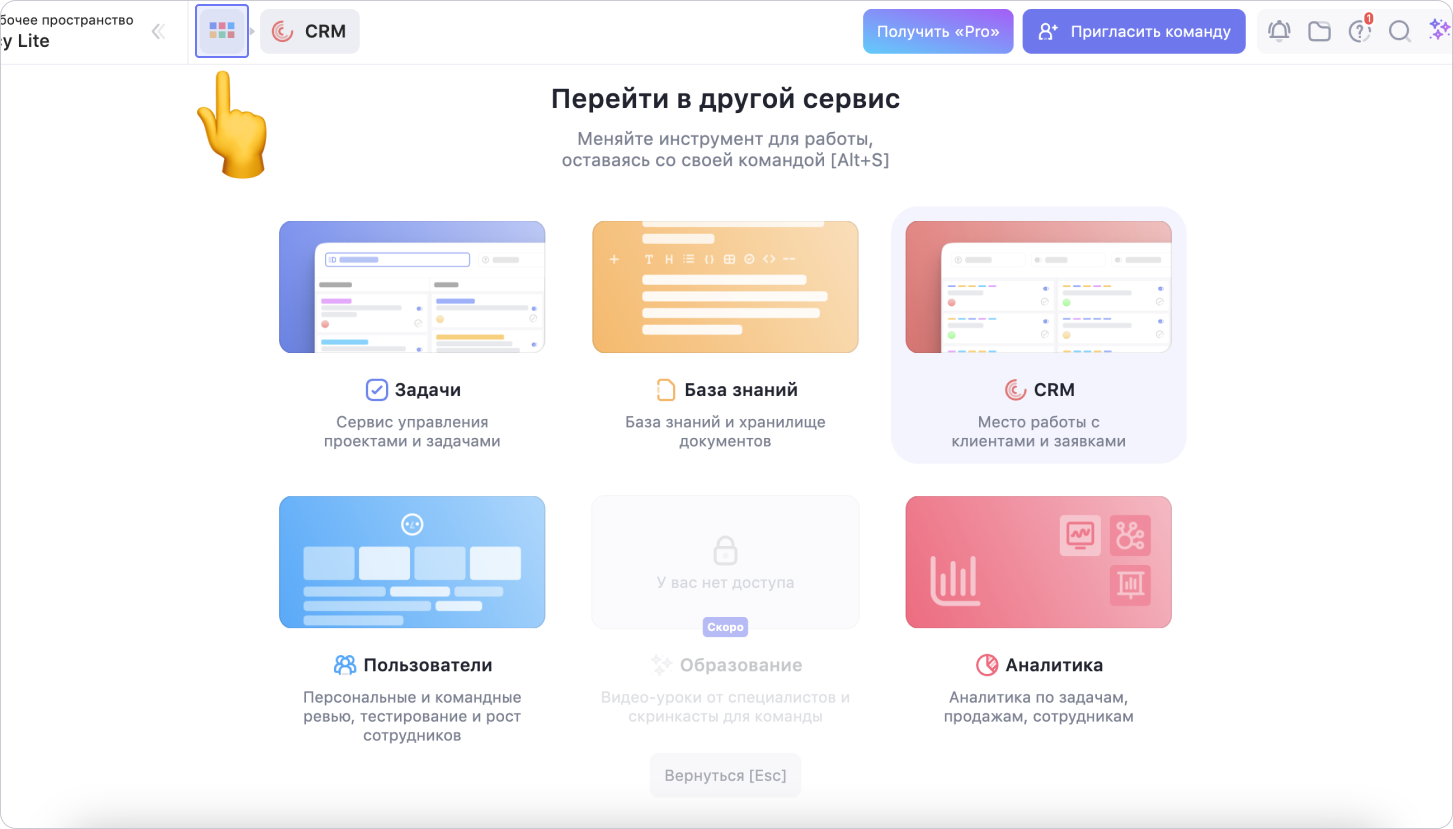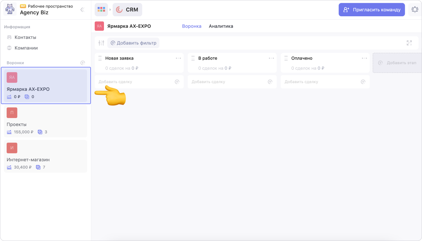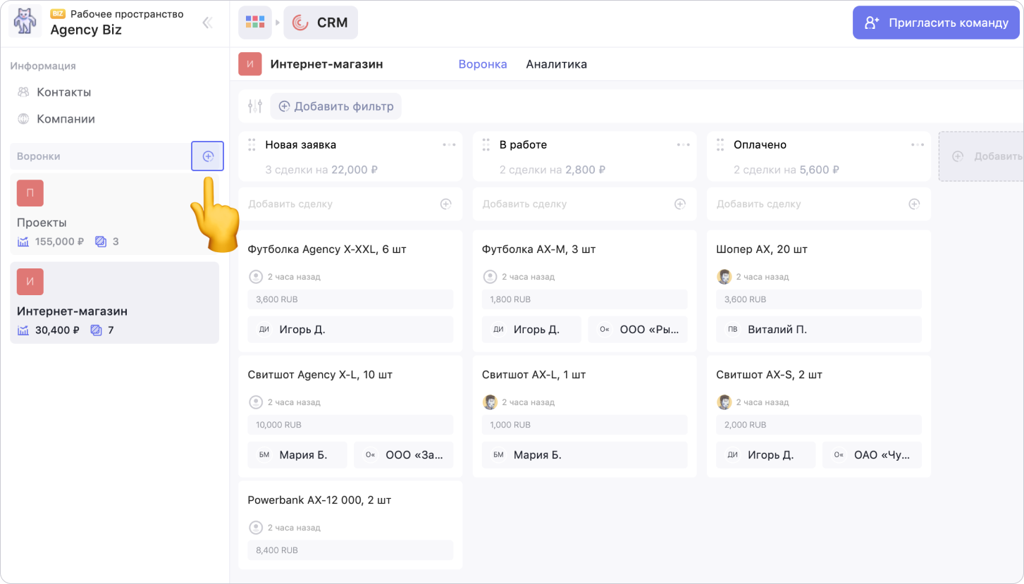 Чтобы создать воронку, перейди в сервис CRM