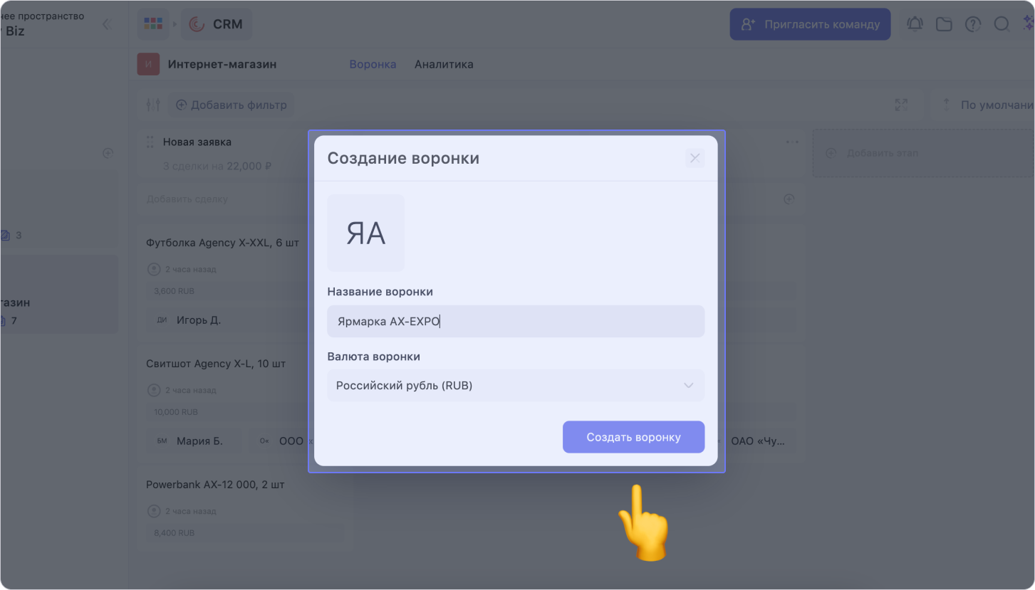 В модальном окне введи название воронки и выбери валюту, а затем нажми Создать воронку