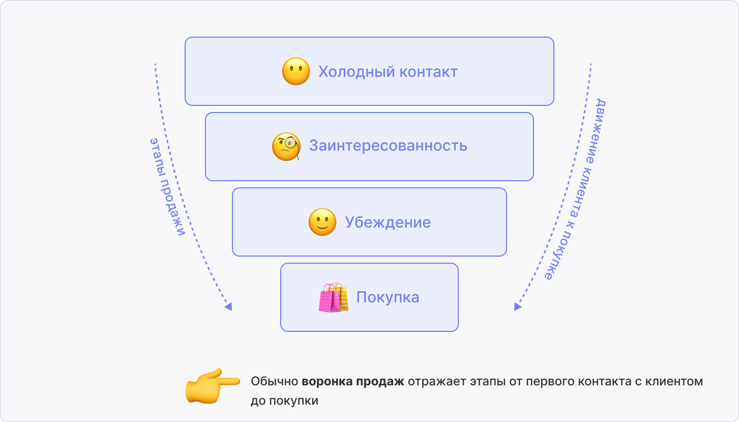 Воронка продаж представляет маркетинговую модель, в которой процесс продажи разделяется на этапы от знакомства клиента с продуктом до завершения сделки. На начальных этапах в воронку попадают все потенциальные клиенты, которые каким-либо образом проявили интерес к продукту. В процессе движения по воронке количество клиентов на каждом этапе уменьшается, и до успешной продажи доходят только заинтересованные в покупке. Возможность отследить движение клиентов по этапам позволяет оценить эффективность каждого взаимодействия с клиентом и увеличить конверсию в покупку