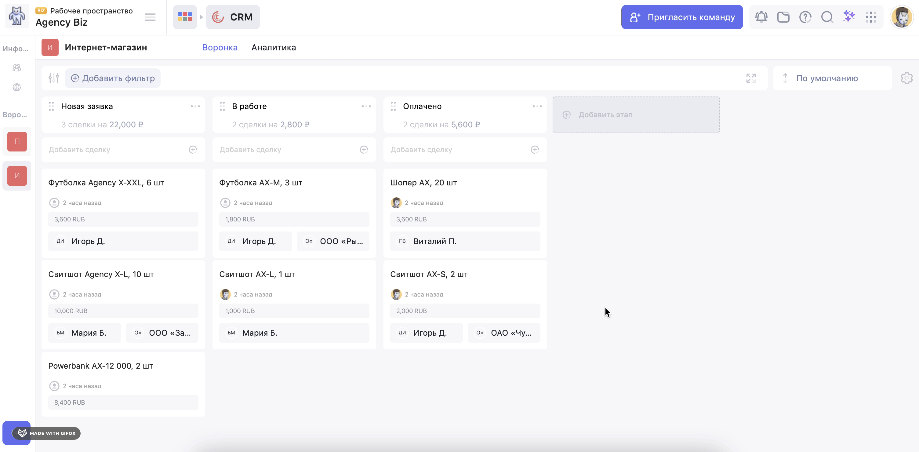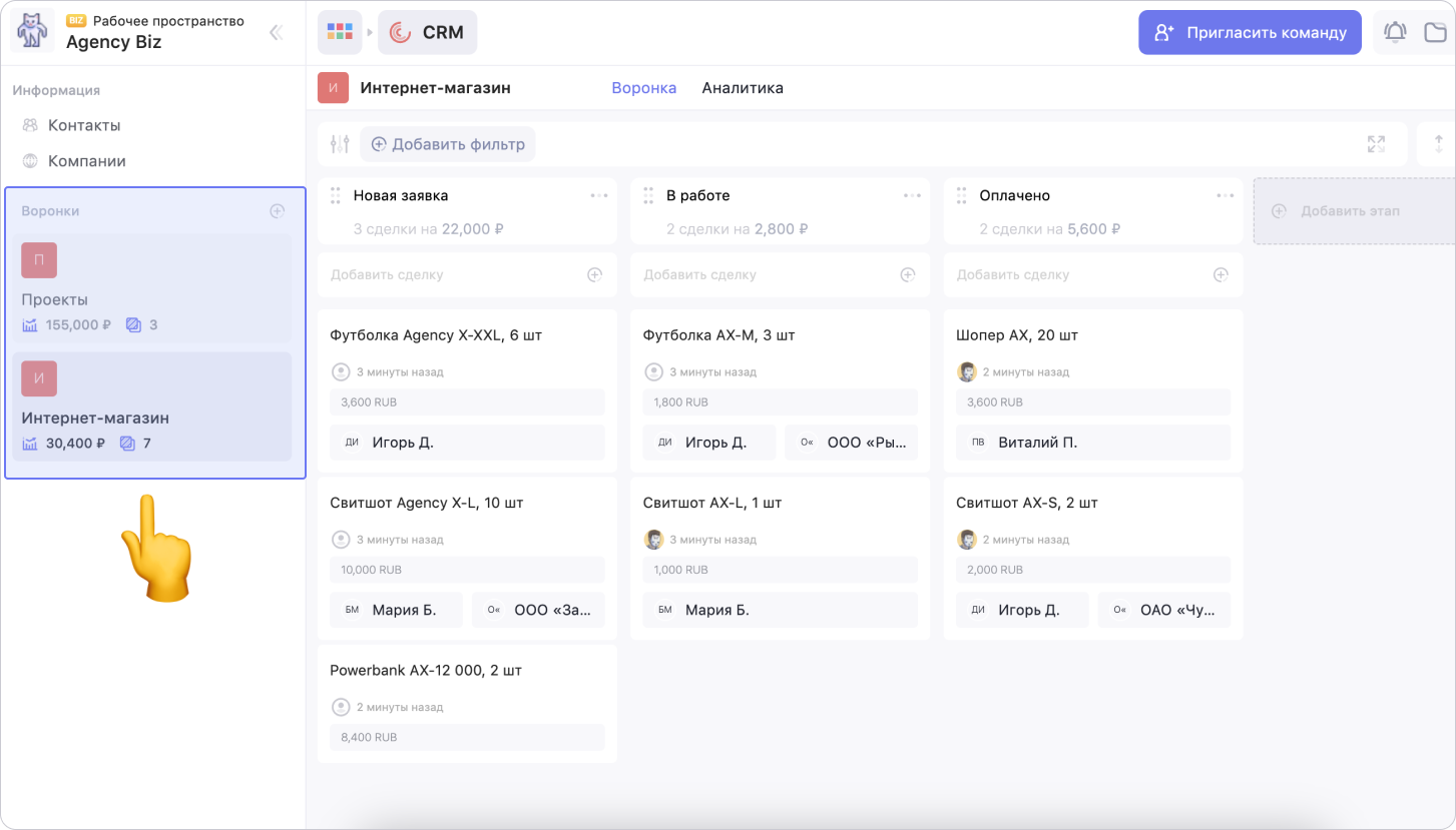 На боковой панели слева отображается список воронок рабочего пространства. Каждая колонка внутри воронки отображает один из этапов продажи
