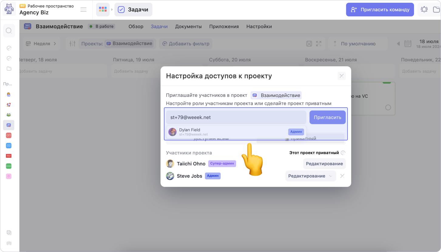 Чтобы добавить нового участника, введи его имя или электронную почту и нажми Пригласить