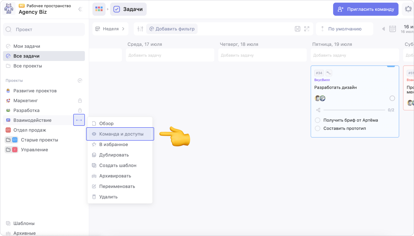Чтобы ограничить доступ к проекту, доске, документу или воронке, перейди в настройки доступов. Для этого нажми на три точки справа от названия элемента, а затем выбери Команда и доступы