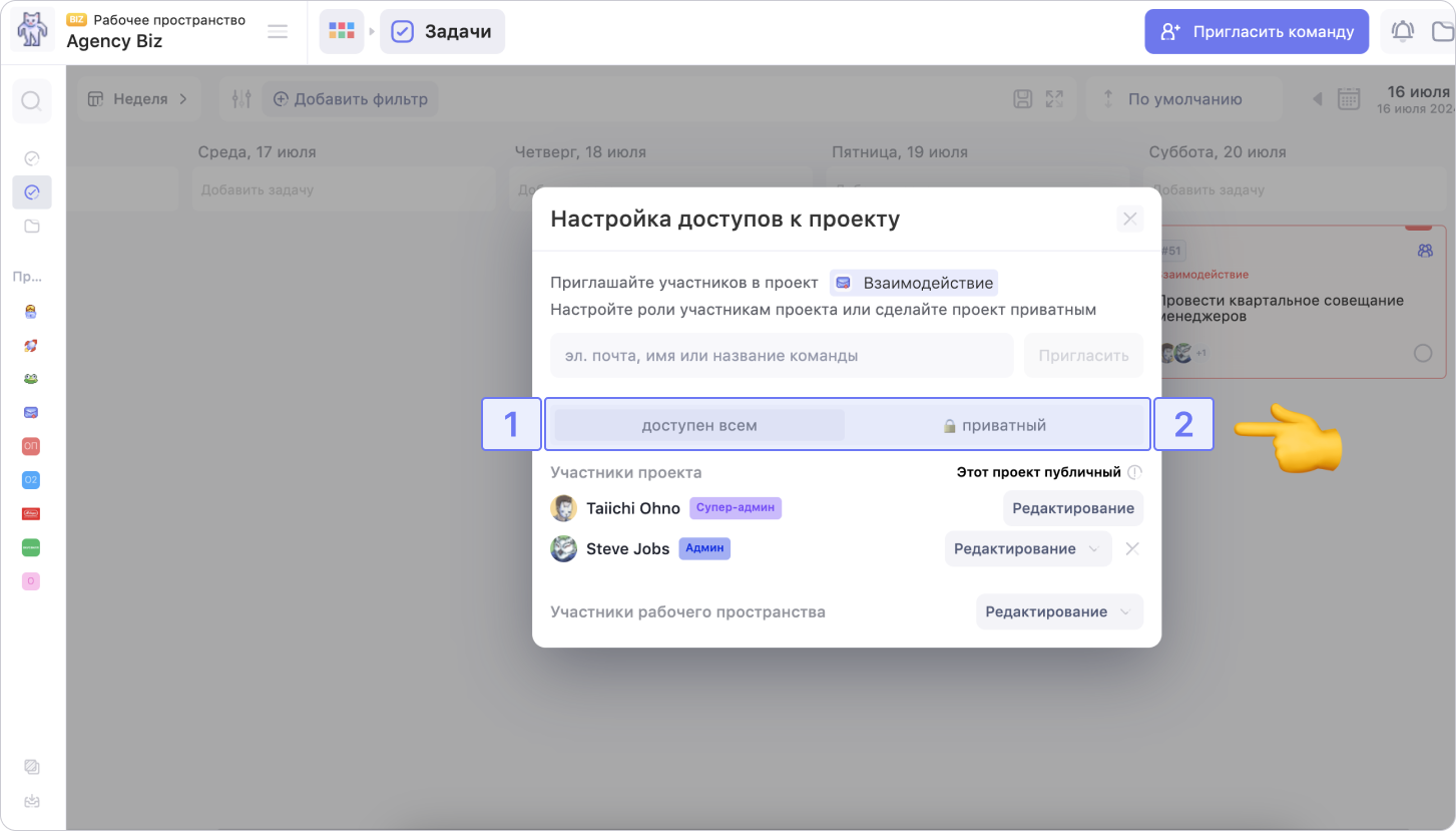 2. приватный. Информация доступна и видна только добавленным участникам. Для остальных участников рабочего пространства информация закрыта и не видна