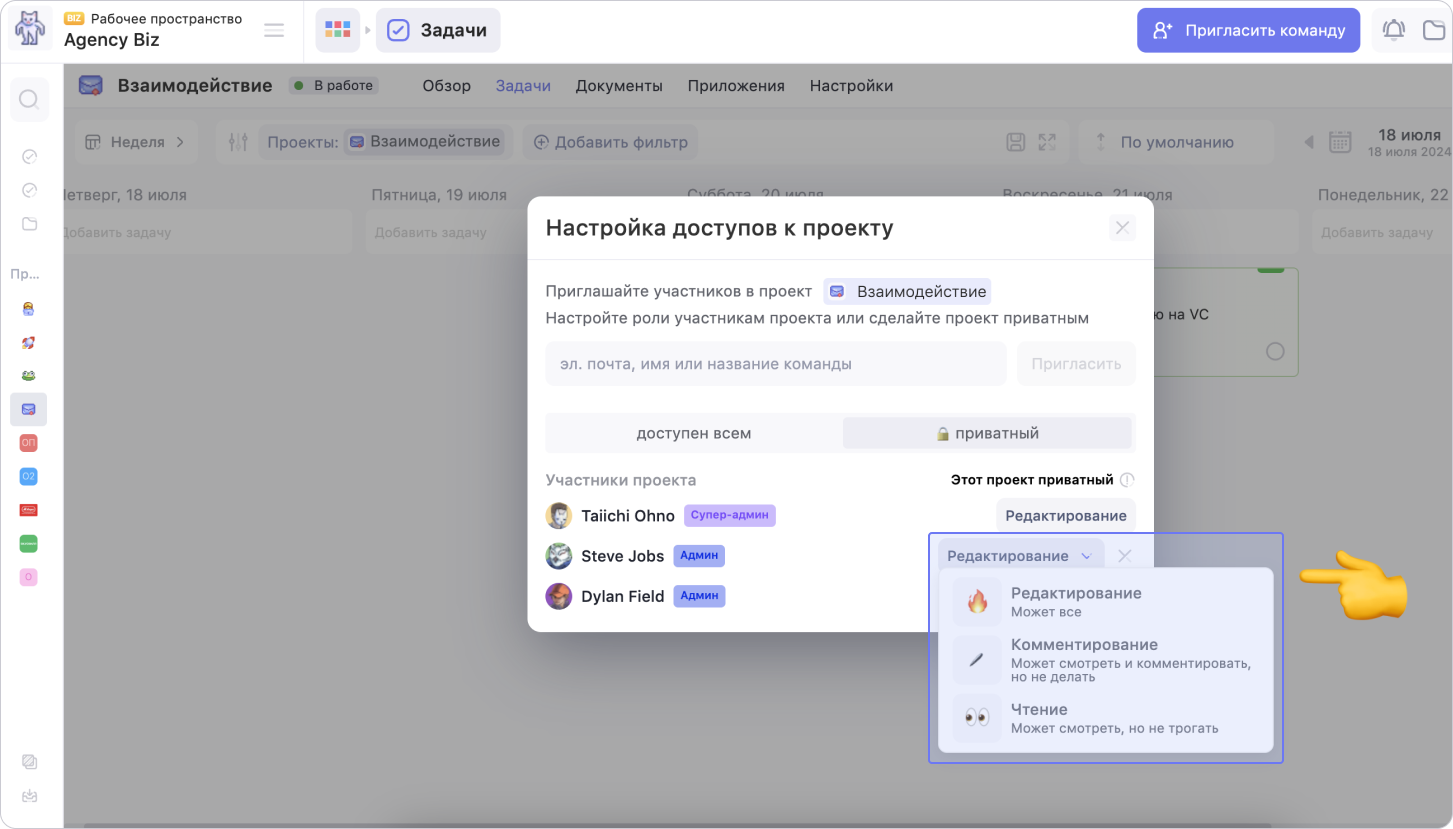 По умолчанию все участники проекта имеют доступ на редактирование. Чтобы изменить права доступа для участника или группы, нажми на поле справа от их имени и выбери один из вариантов: