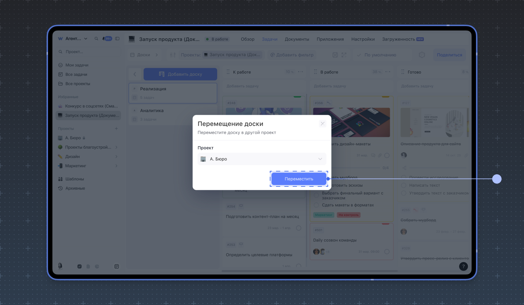 Чтобы переместить доску в другой проект, нажмите на три точки рядом с её названием, выберите Переместить.