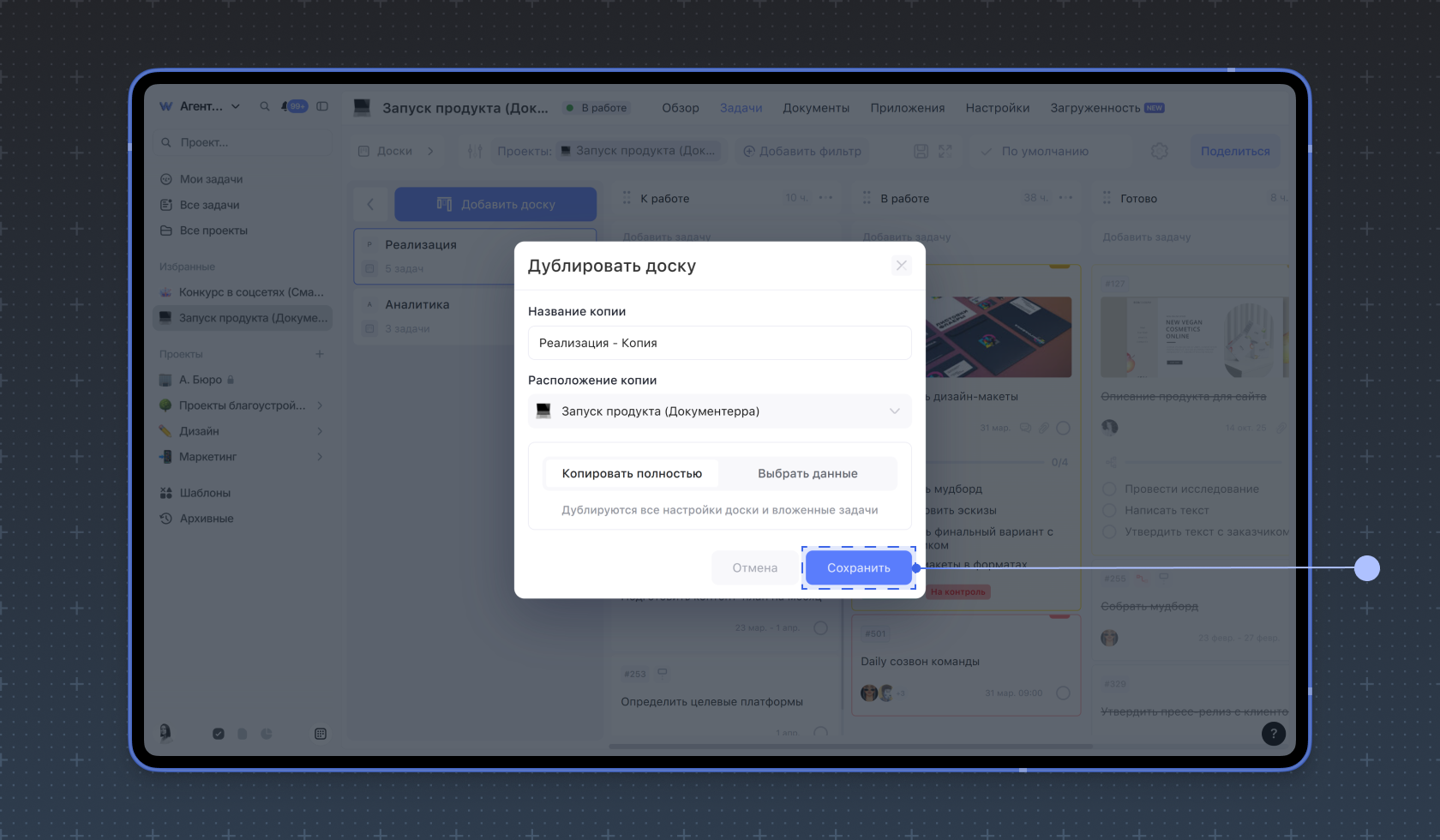 Введите название доски, выберите место расположения копии и отметьте данные, которые нужно скопировать. Копировать можно все данные или выбрать нужные. Нажмите на кнопку Сохранить.