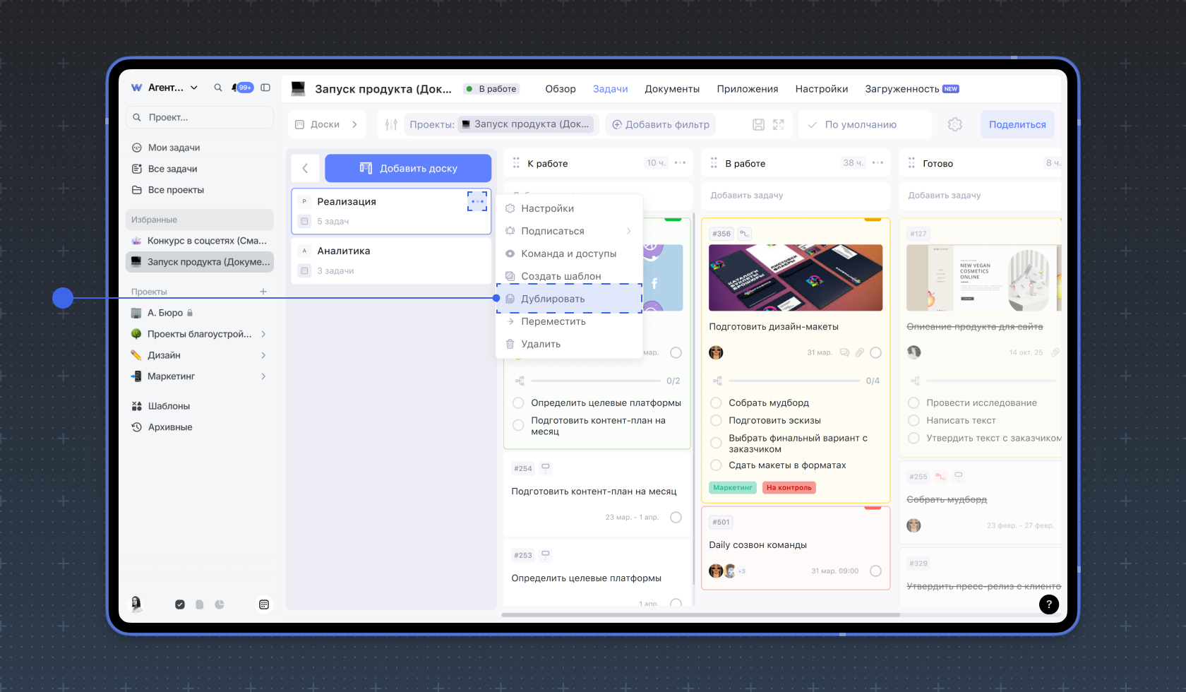 В списке досок проекта выберите ту, которую нужно скопировать. Нажмите на три точки слева от её названия и выберите Дублировать.