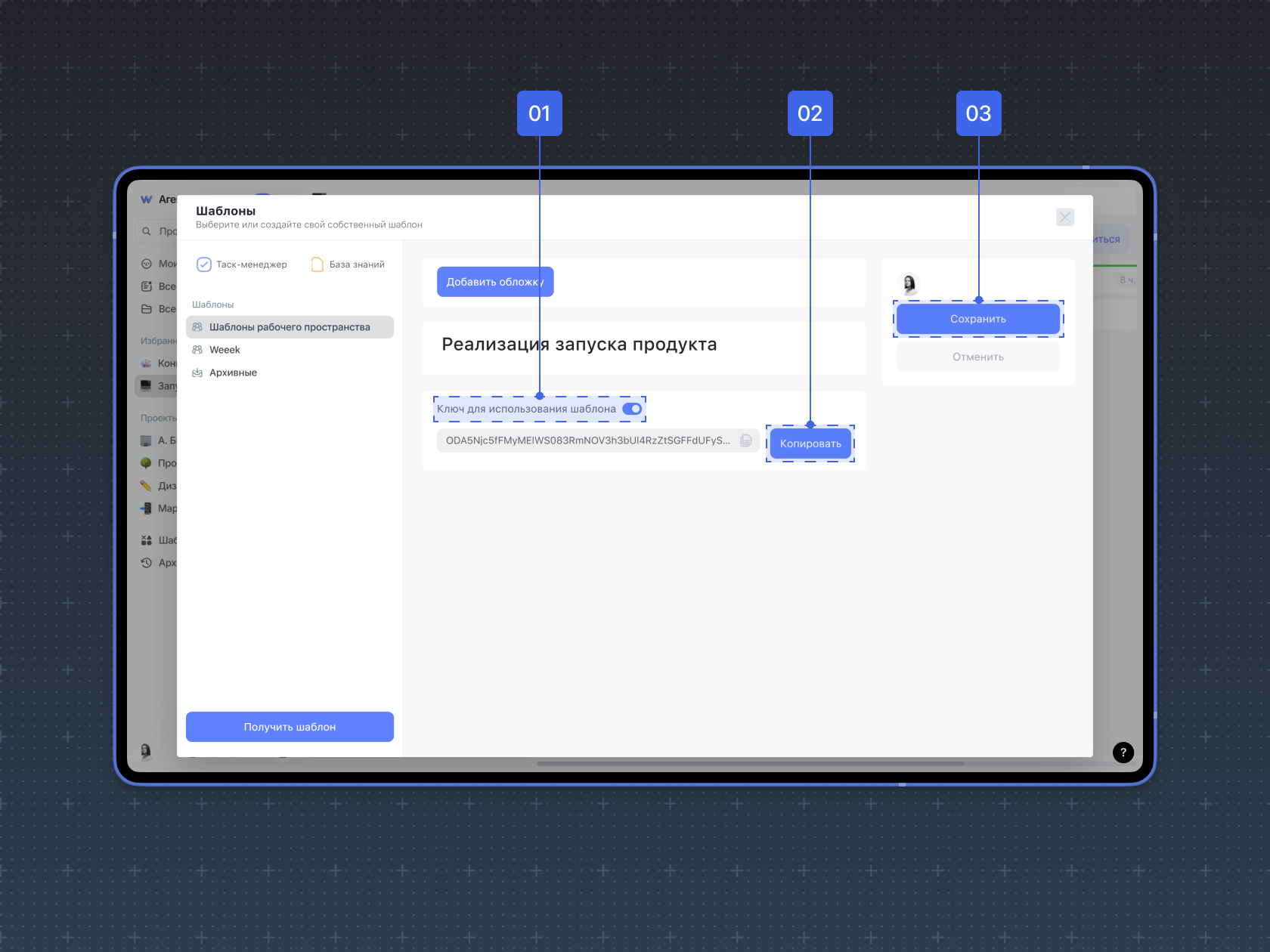 В открывшемся окне (1) активируйте переключатель Ключ для использования шаблона, (2) нажмите Копировать, а затем (3) Сохранить.