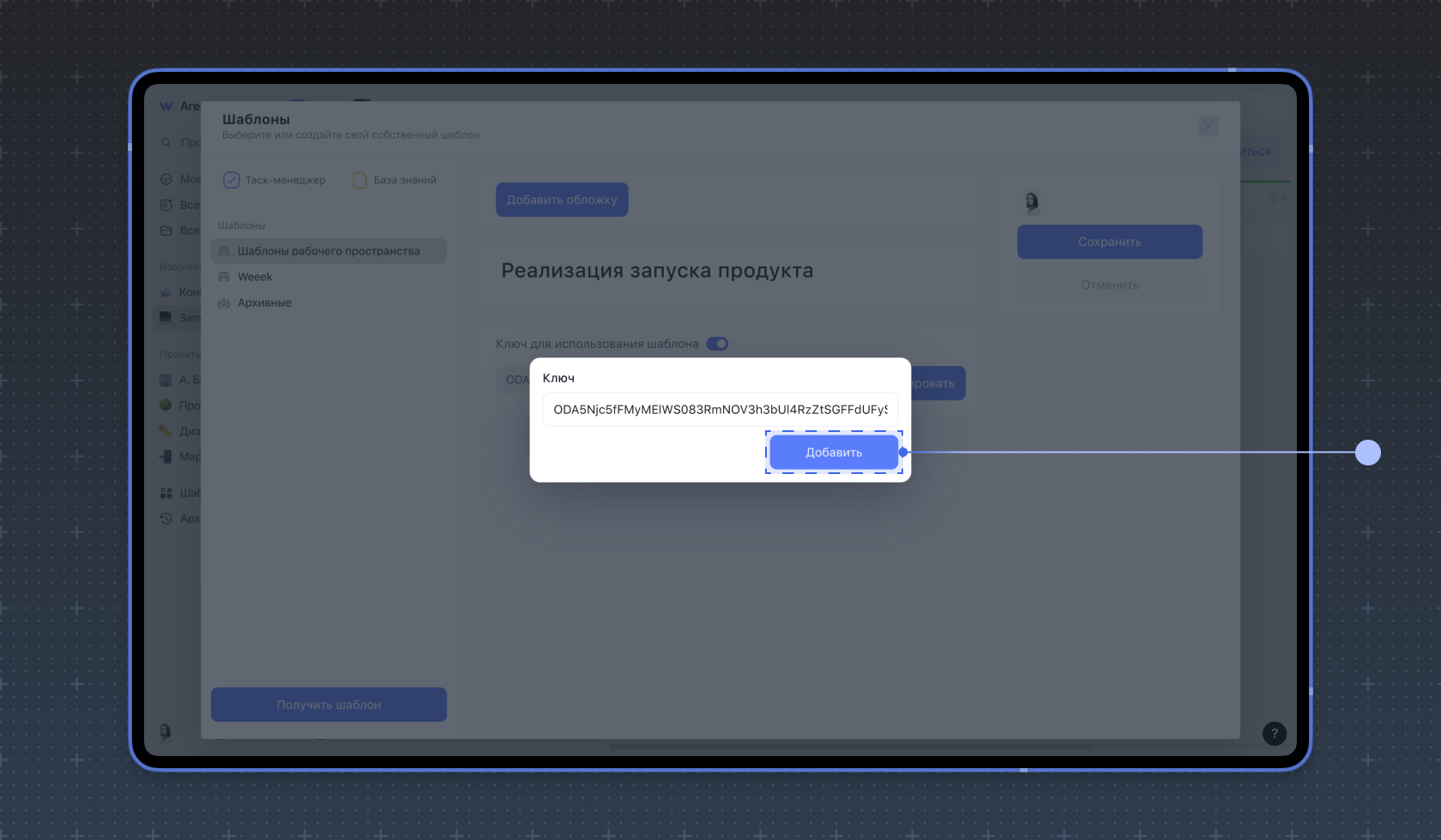Вставьте скопированный ранее ключ и нажмите Добавить.
