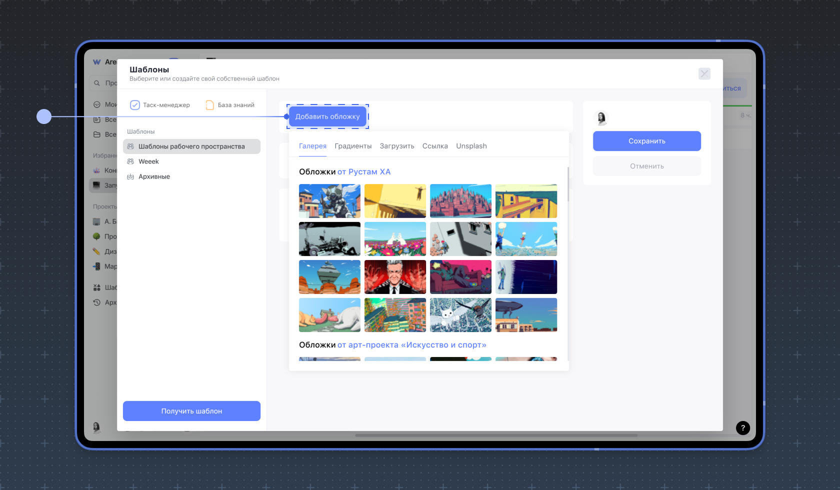 Нажмите Добавить обложку, чтобы выбрать обложку шаблона. Вы можете выбрать изображение из библиотеки или загрузить своё.