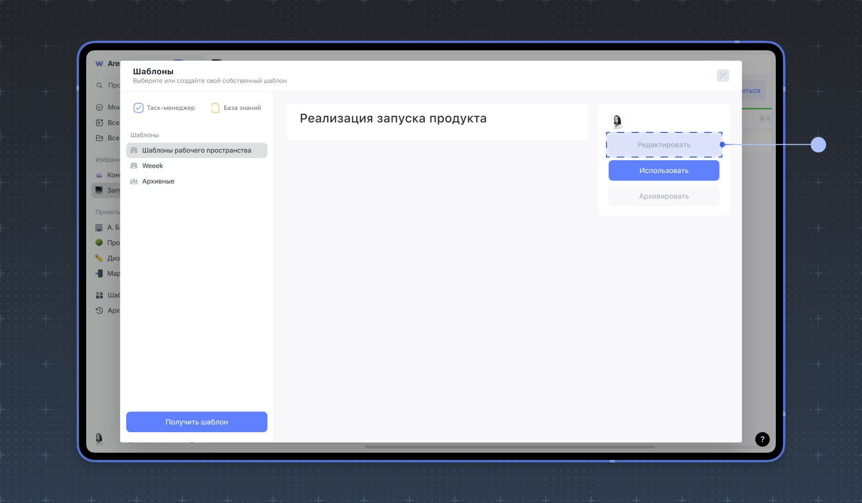 Чтобы использовать шаблон в другом рабочем пространстве, сначала скопируйте ключ шаблона. Для этого перейдите в Шаблоны рабочего пространства и кликните на тот, который нужно перенести. Нажмите Редактировать.