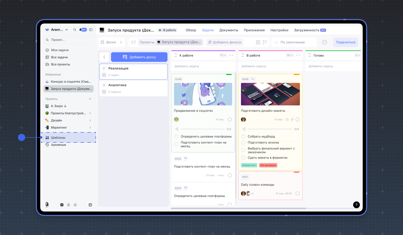 Шаблоны доски помогают ускорить работу, когда нужно настроить одну и ту же доску для повторяющихся процессов.