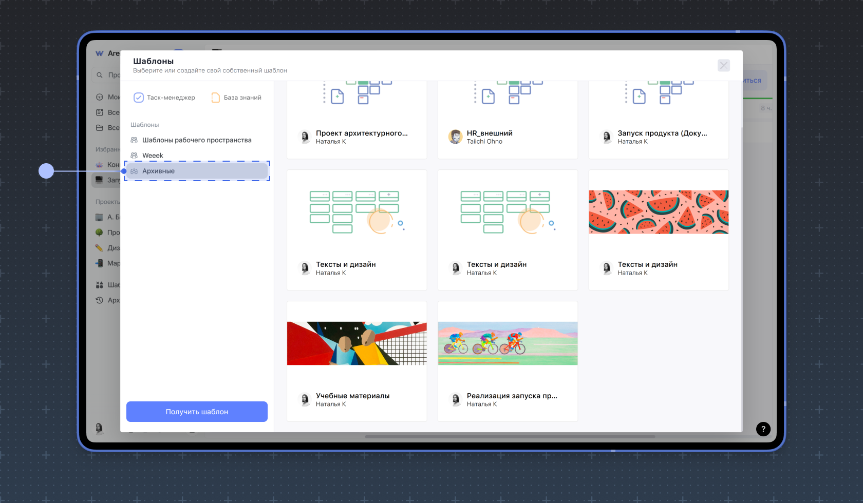 Чтобы архивировать неактуальный шаблон, выберите его в списке и нажмите Архивировать.