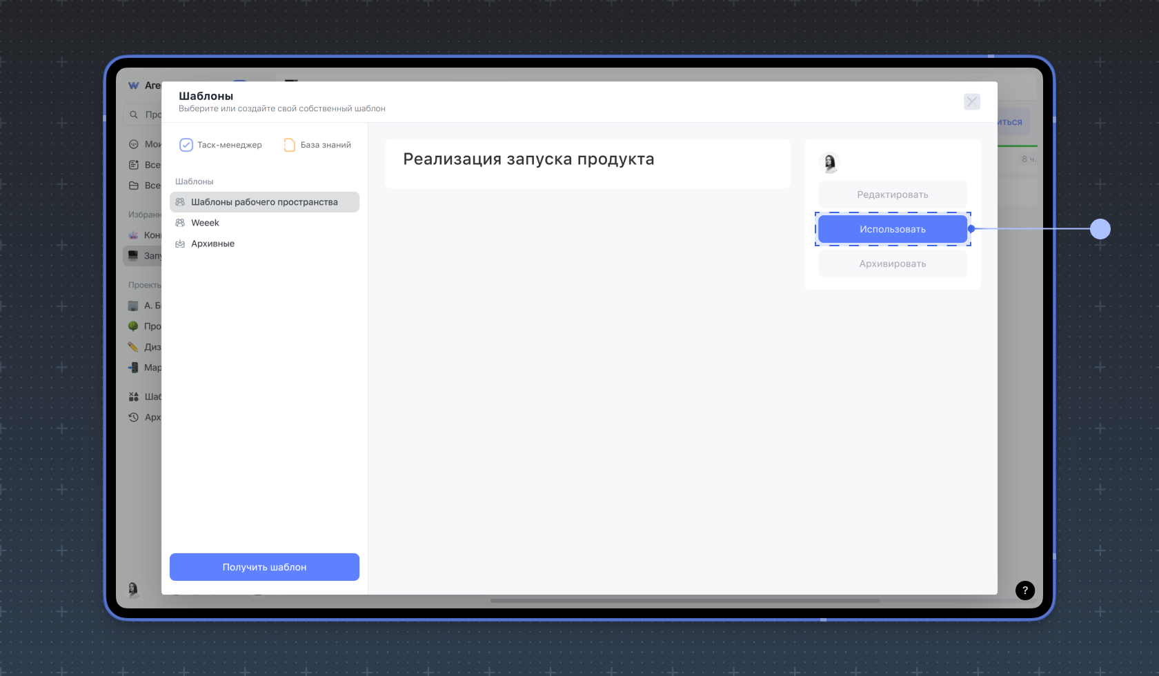 Шаблон появится в списке шаблонов рабочего пространства. Выберите проект, в который нужно добавить доску, перейдите в шаблоны рабочего пространства, выберите шаблон доски и нажмите Использовать.