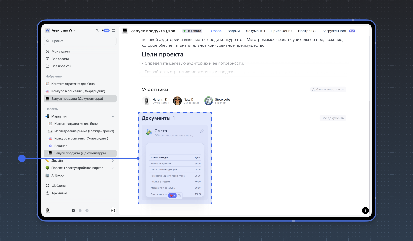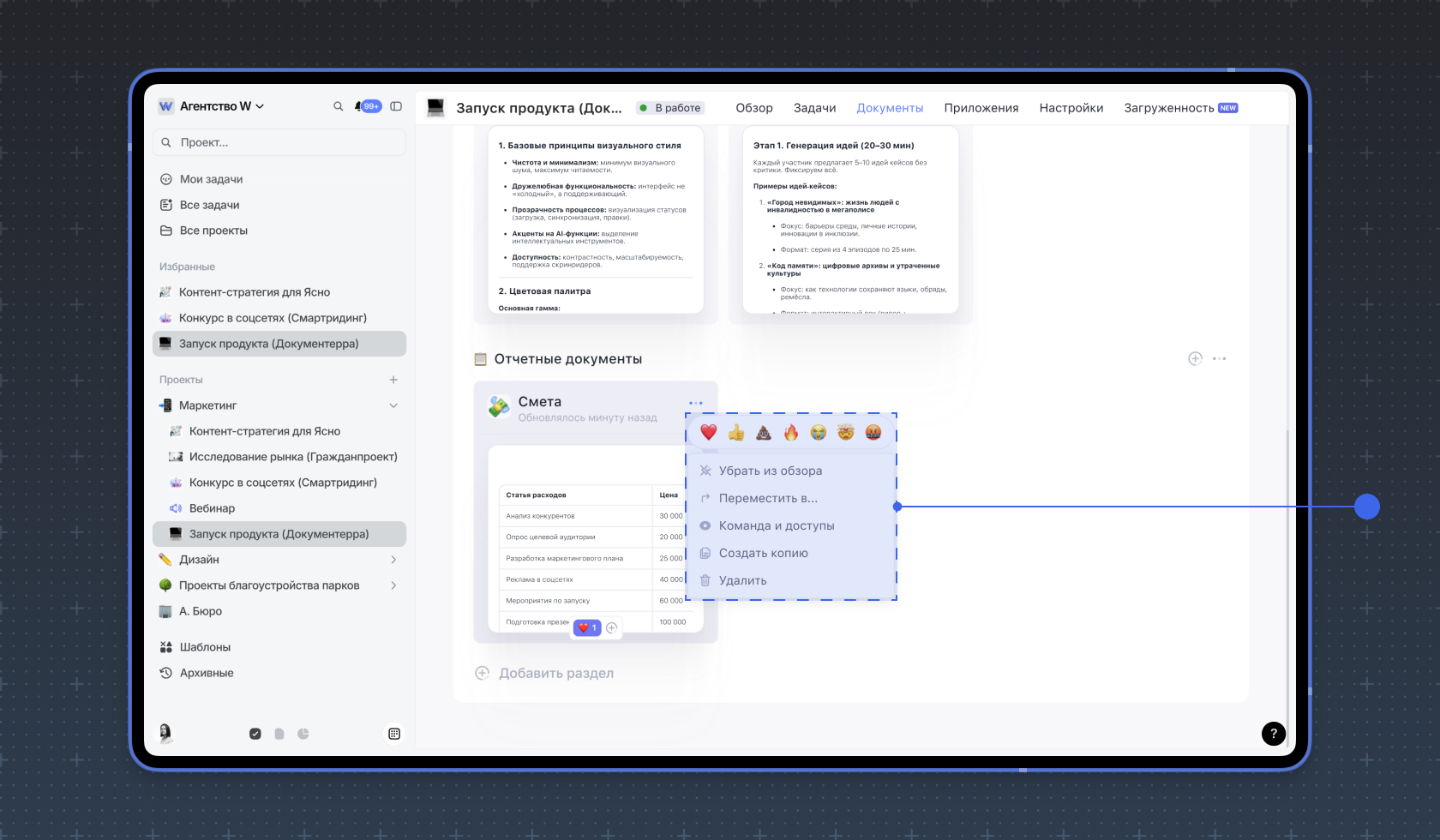 2. Закрепить в обзоре. Закрепите документ для быстрого доступа через обзор проекта. Чтобы посмотреть закреплённые документы, в меню проекта выберите Обзор