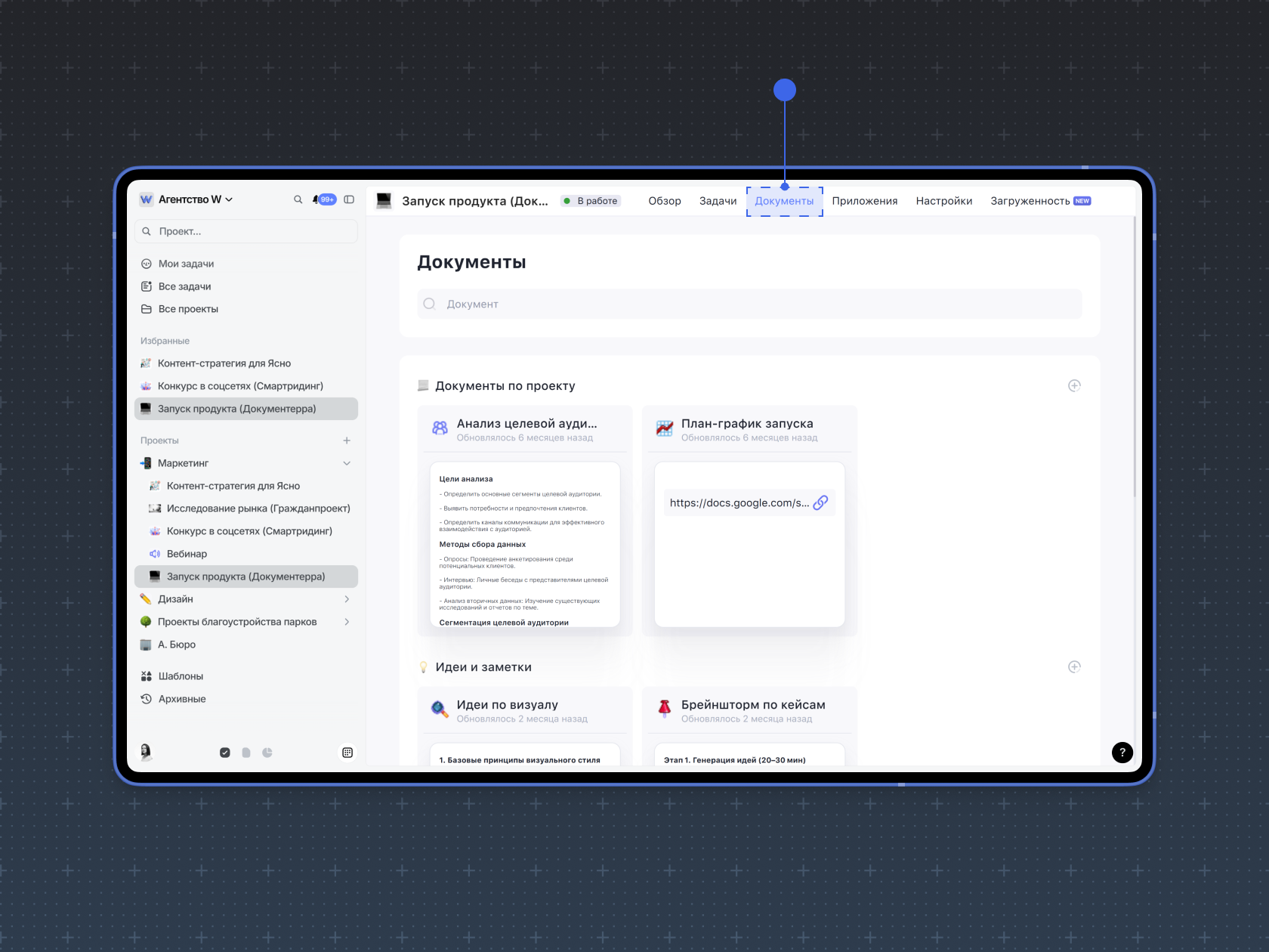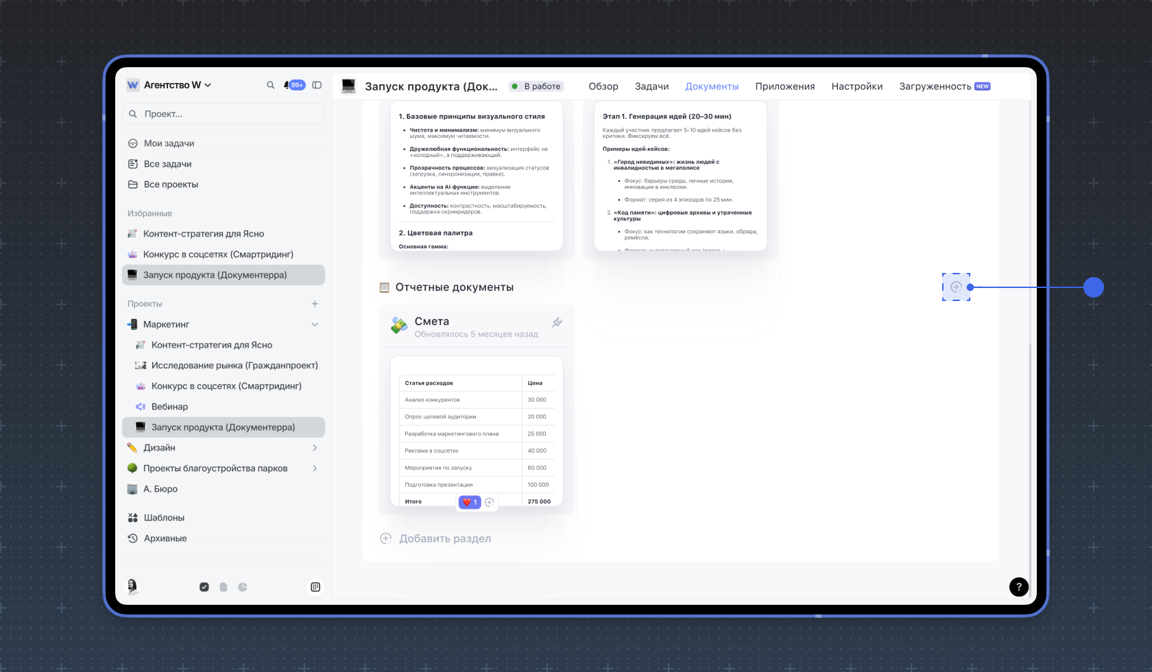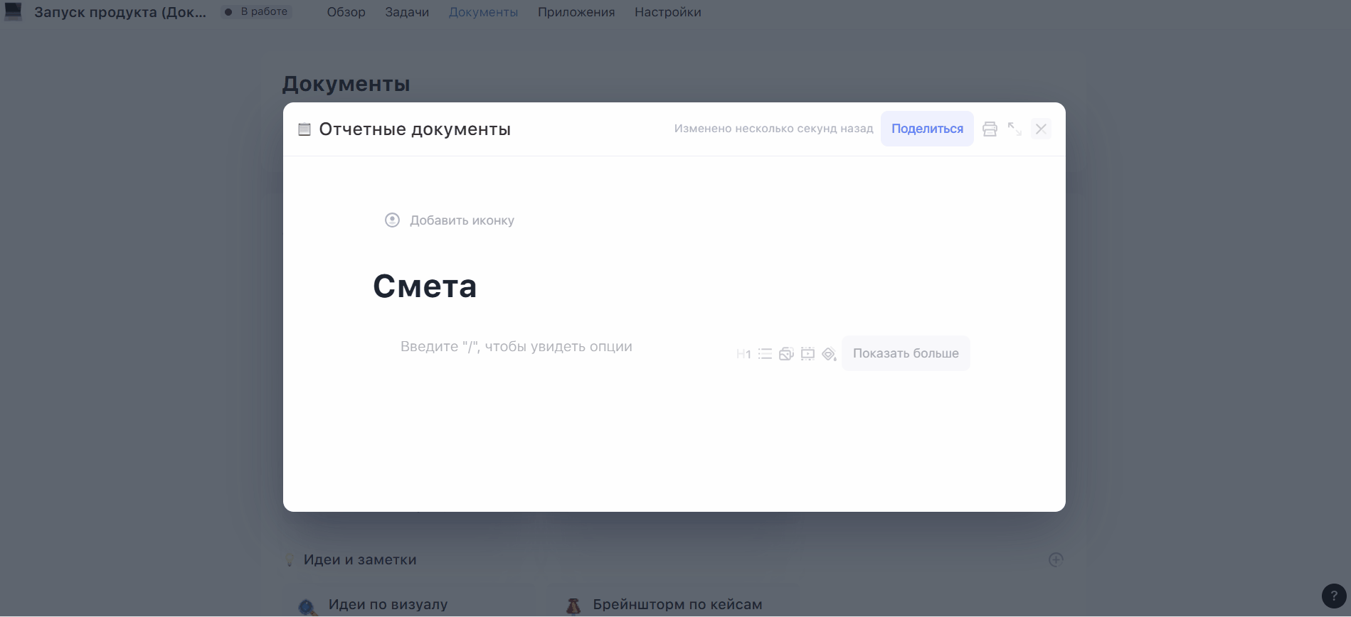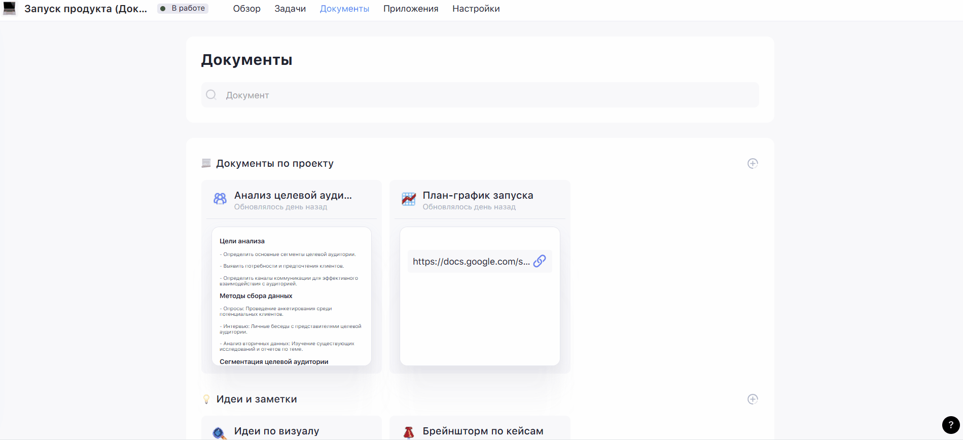 Документы проекта позволяют собирать в одном месте все заметки, идеи, гипотезы и важные материалы по проекту. Это помогает сохранять полный контекст, упрощает обсуждения и совместную работу команды.