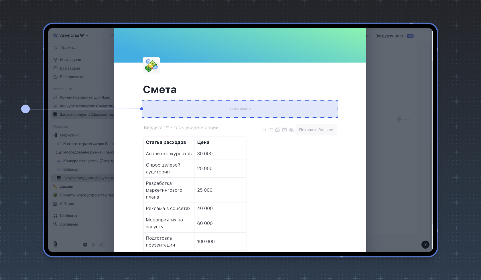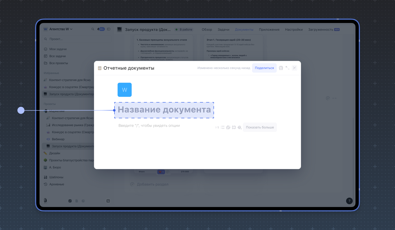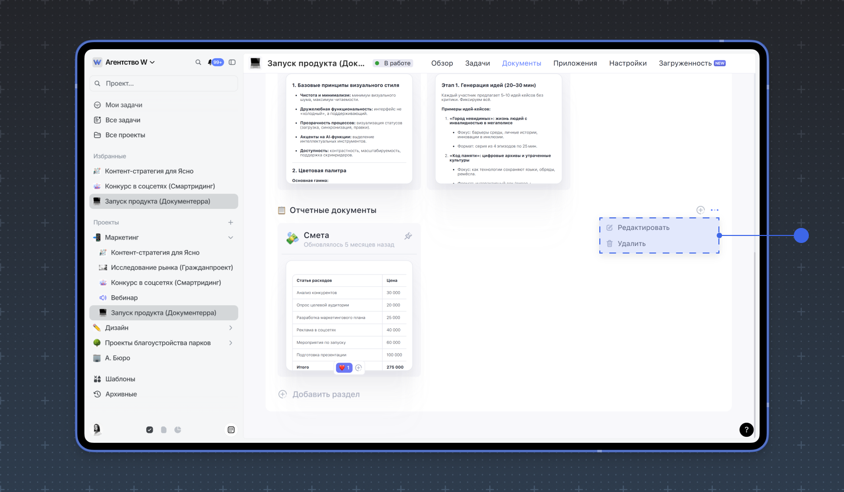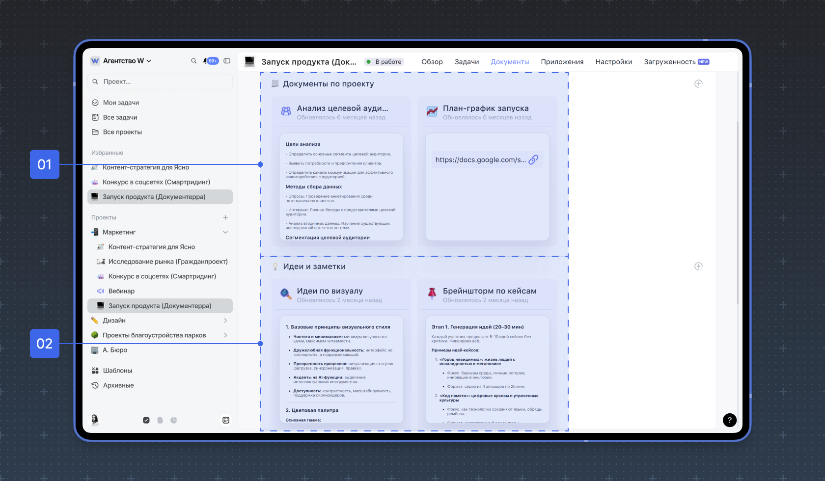 Документы проекта позволяют собирать в одном месте все заметки, идеи, гипотезы и важные материалы по проекту. Это помогает сохранять полный контекст, упрощает обсуждения и совместную работу команды.