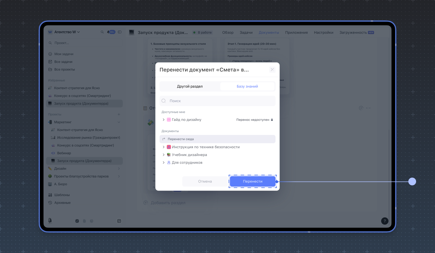 3. Переместить в. Выберите, куда переместить документ: в другой раздел Документов проекта или в Базу знаний рабочего пространства. Затем нажмите Перенести