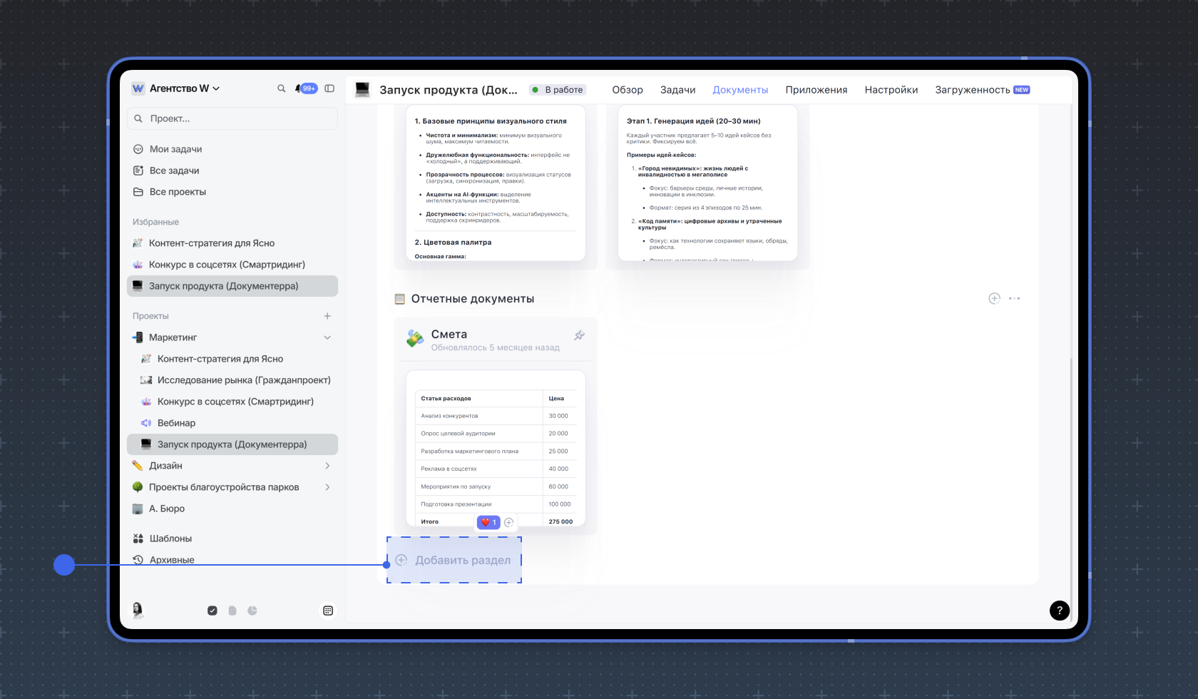 Чтобы добавить раздел в документы проекта, введите его название в поле Добавить раздел и нажмите Enter.