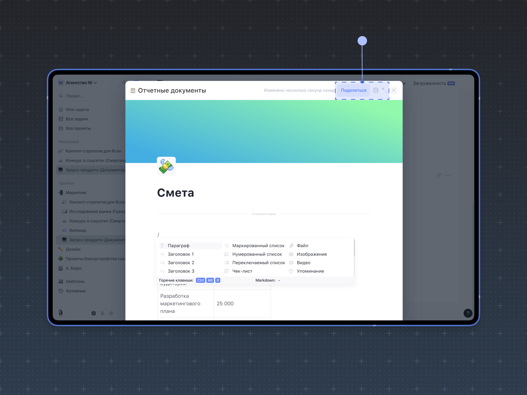 Чтобы наполнить документ, используйте тексто-блочный редактор. С его помощью можно форматировать текст: добавлять списки, заголовки, а также вставлять дополнительные элементы, например, ссылки или изображения. Чтобы вызвать меню редактора, введите /.