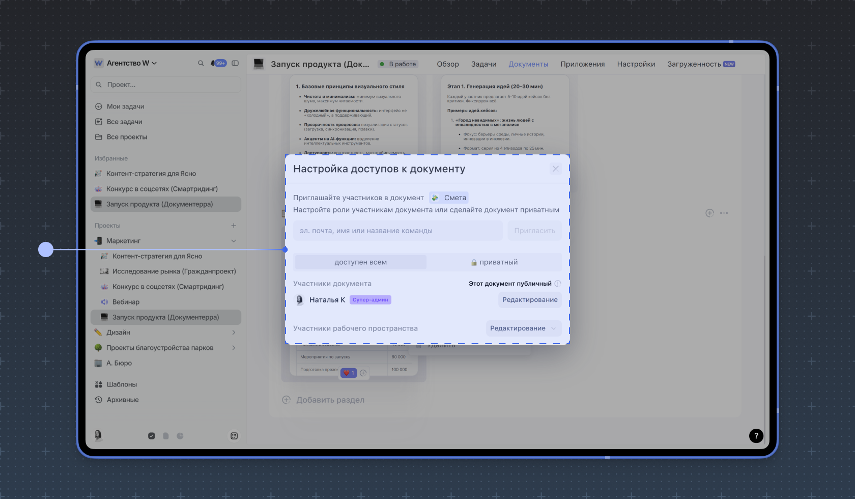 4. Команда и доступы. Настройте приватность документа и доступы участников