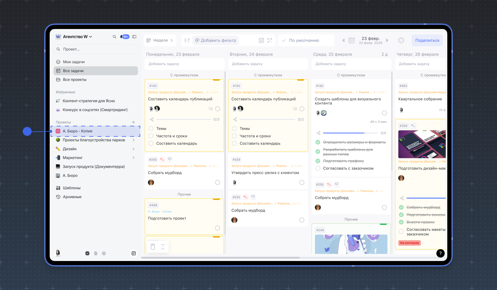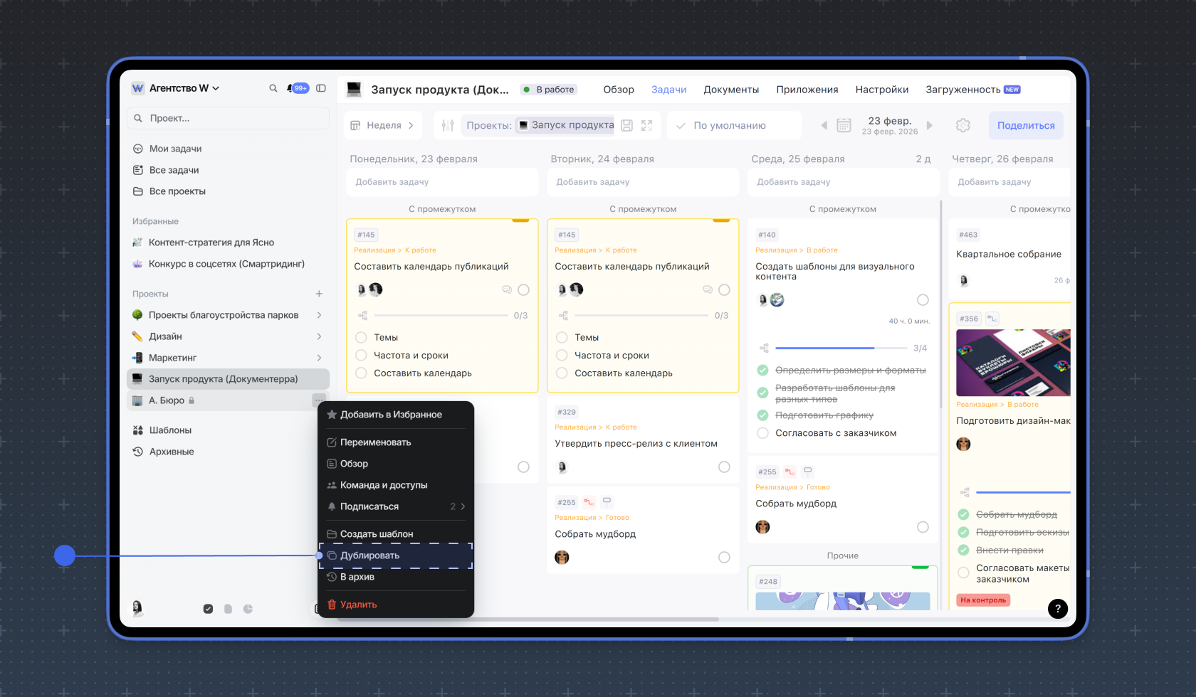 WEEEK позволяет быстро создавать новые проекты через копирование уже существующих. Копируется описание, вложенные данные и задачи. Копирование позволяет сократить время создания схожих проектов внутри одного рабочего пространства.