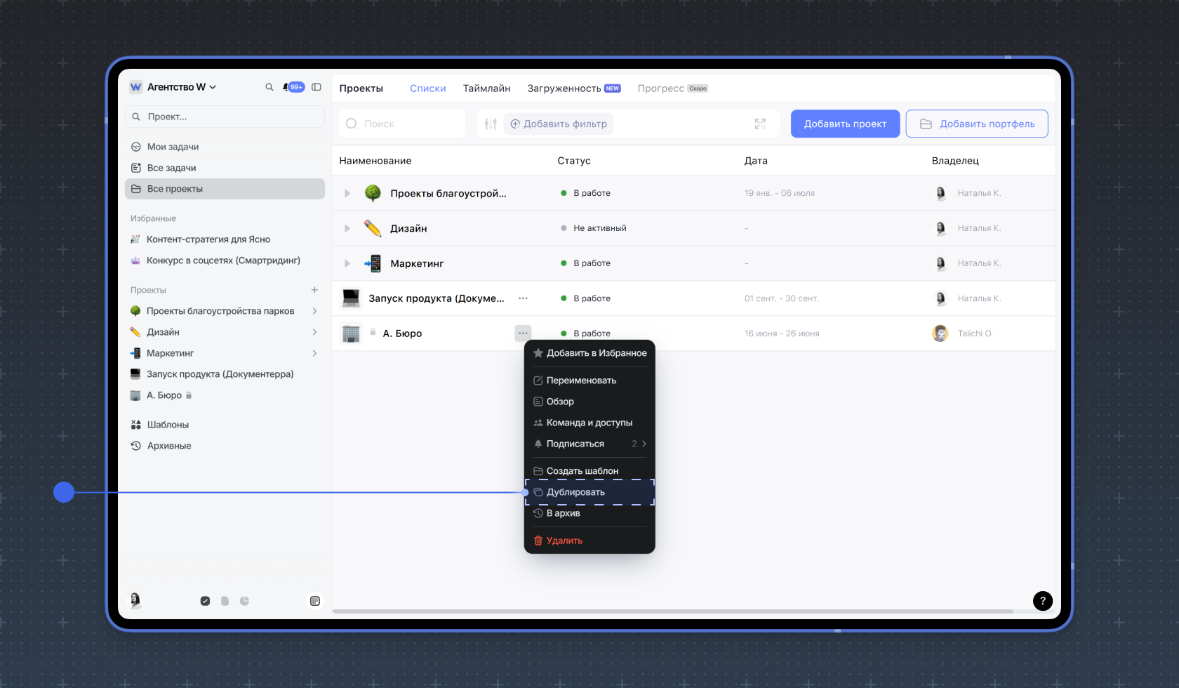 Чтобы создать копию проекта, перейдите в раздел Все проекты, выберите проект для копирования. Нажмите на три точки справа от его названия и в выпадающем списке выберите Дублировать.