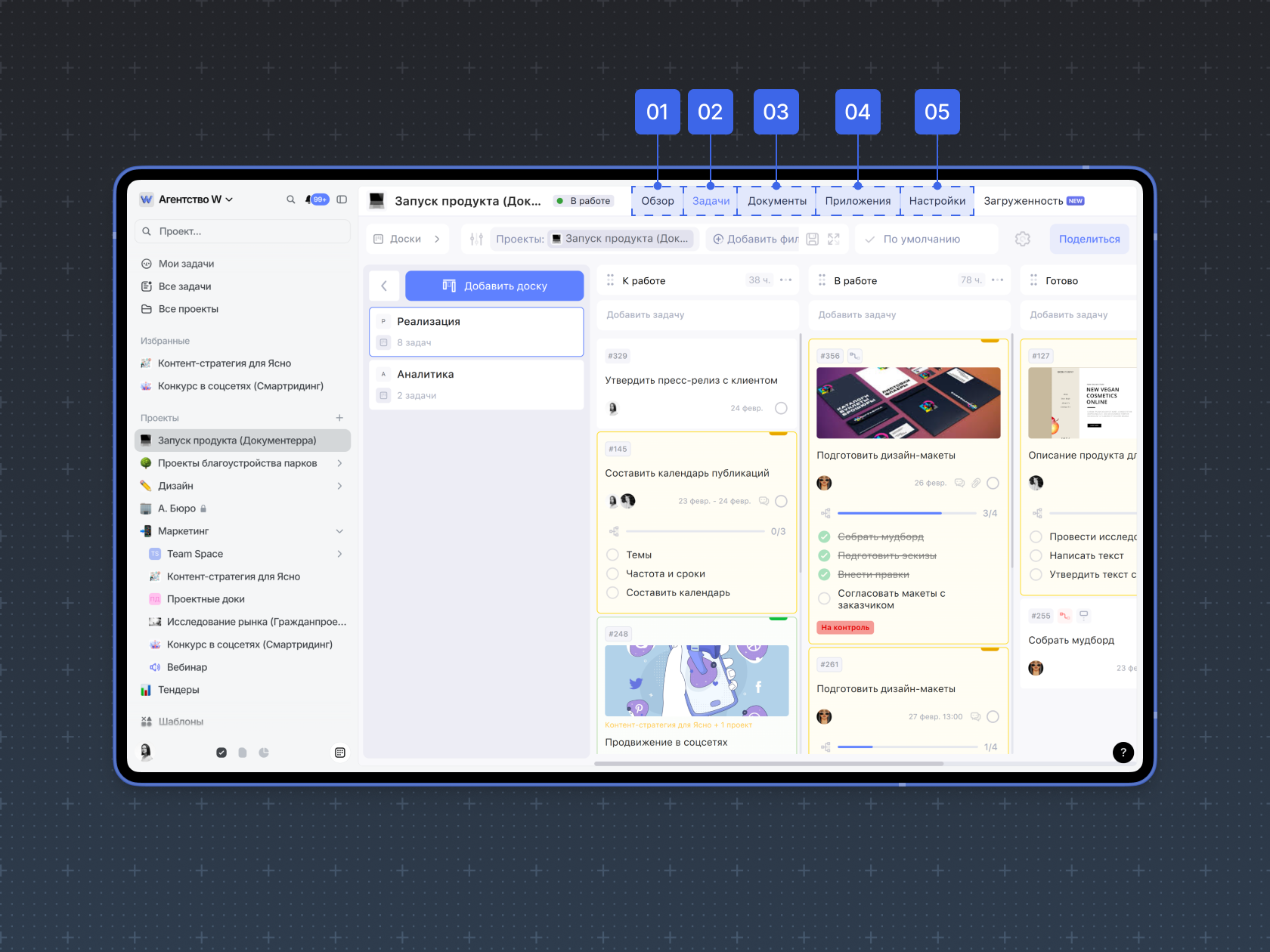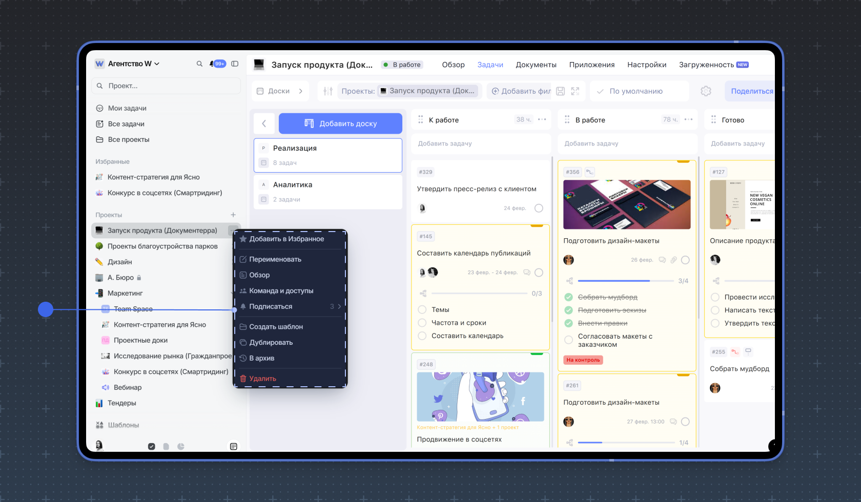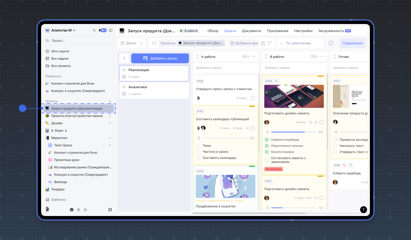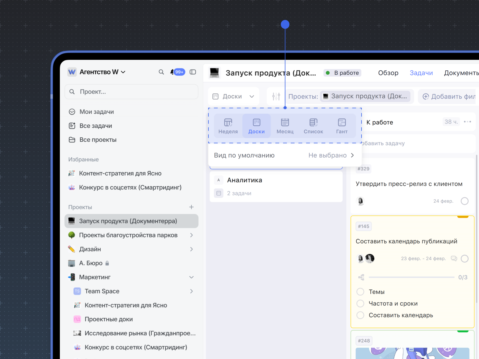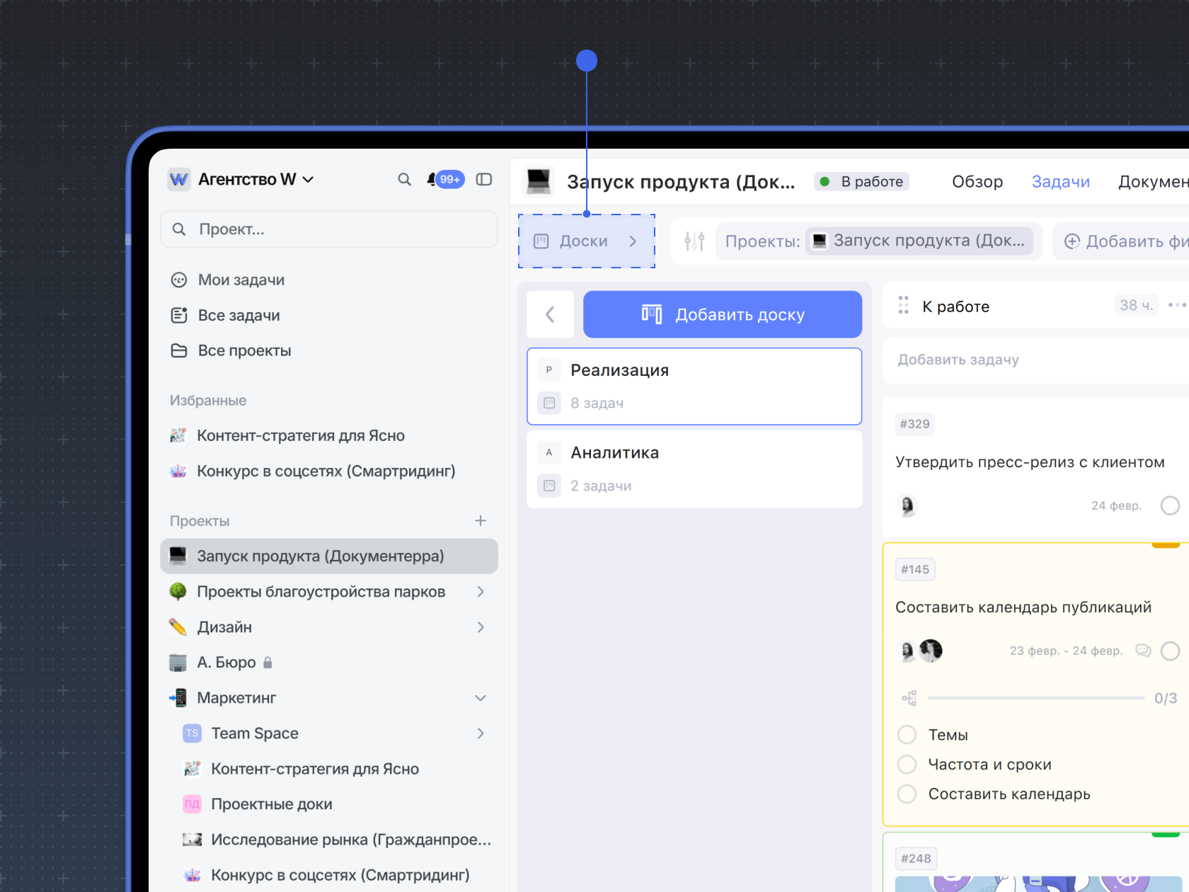 Проект позволяет группировать задачи и концентрировать работу отдела, команды или направления в одном месте, чтобы упорядочить рабочий процесс.