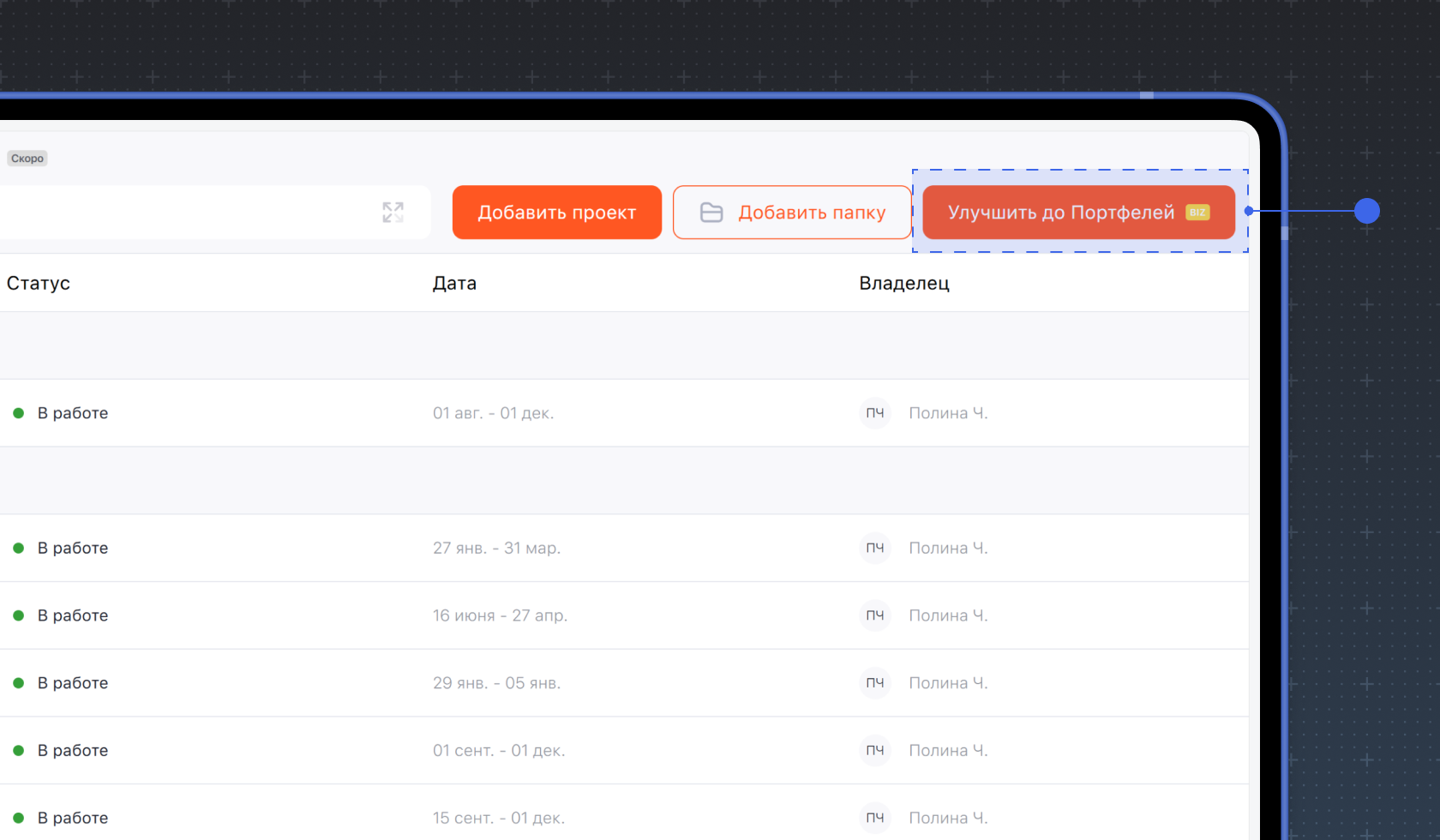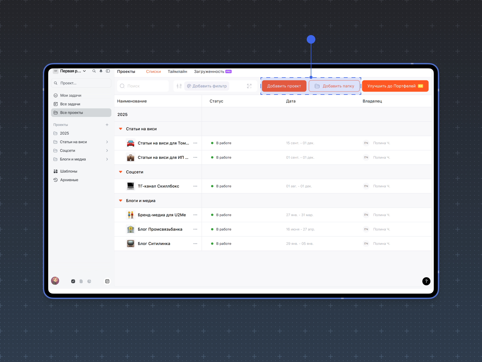 Папки и портфели позволяют группировать проекты по тематике и направлениям. Портфели отображаются только на тарифе Бизнес и являются расширенной версией папок. Они позволяют отслеживать статус проектов, находящихся внутри портфелей