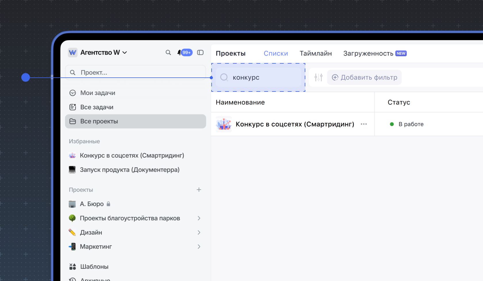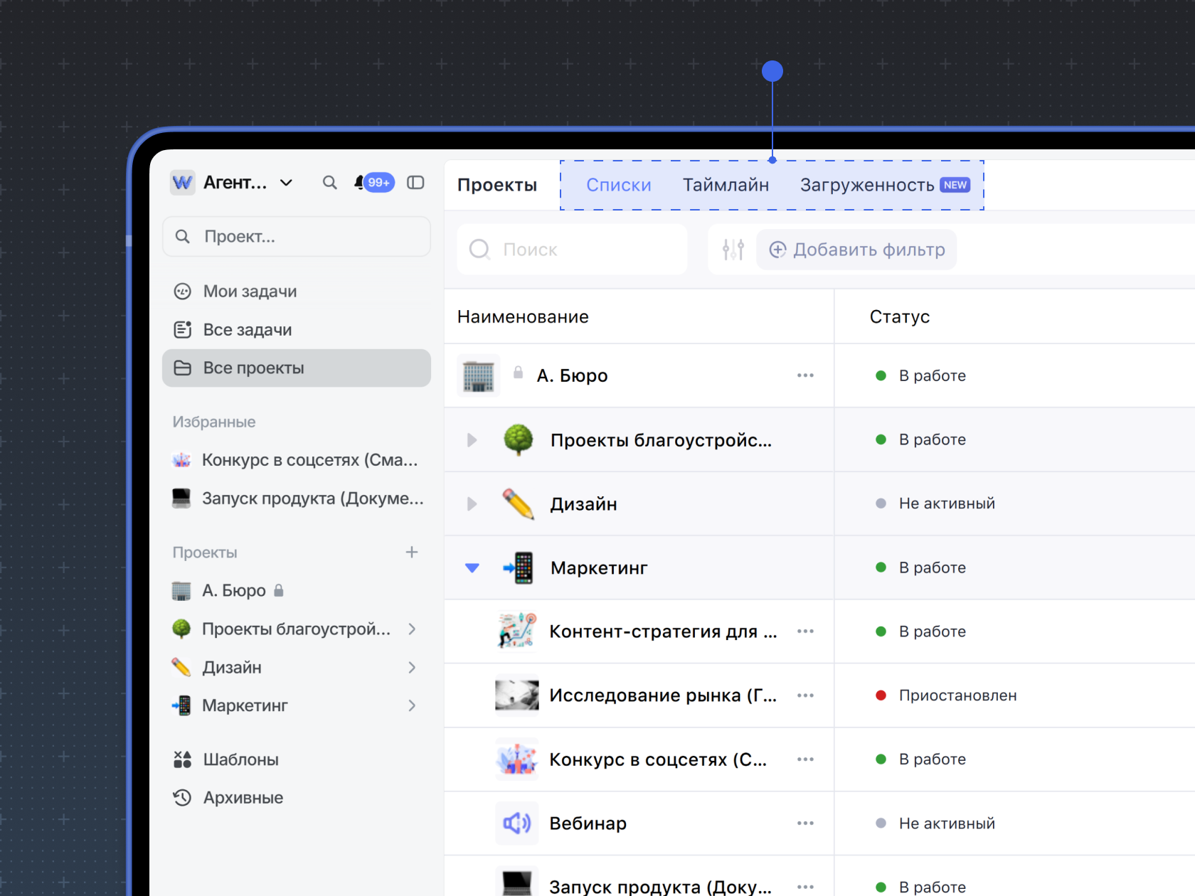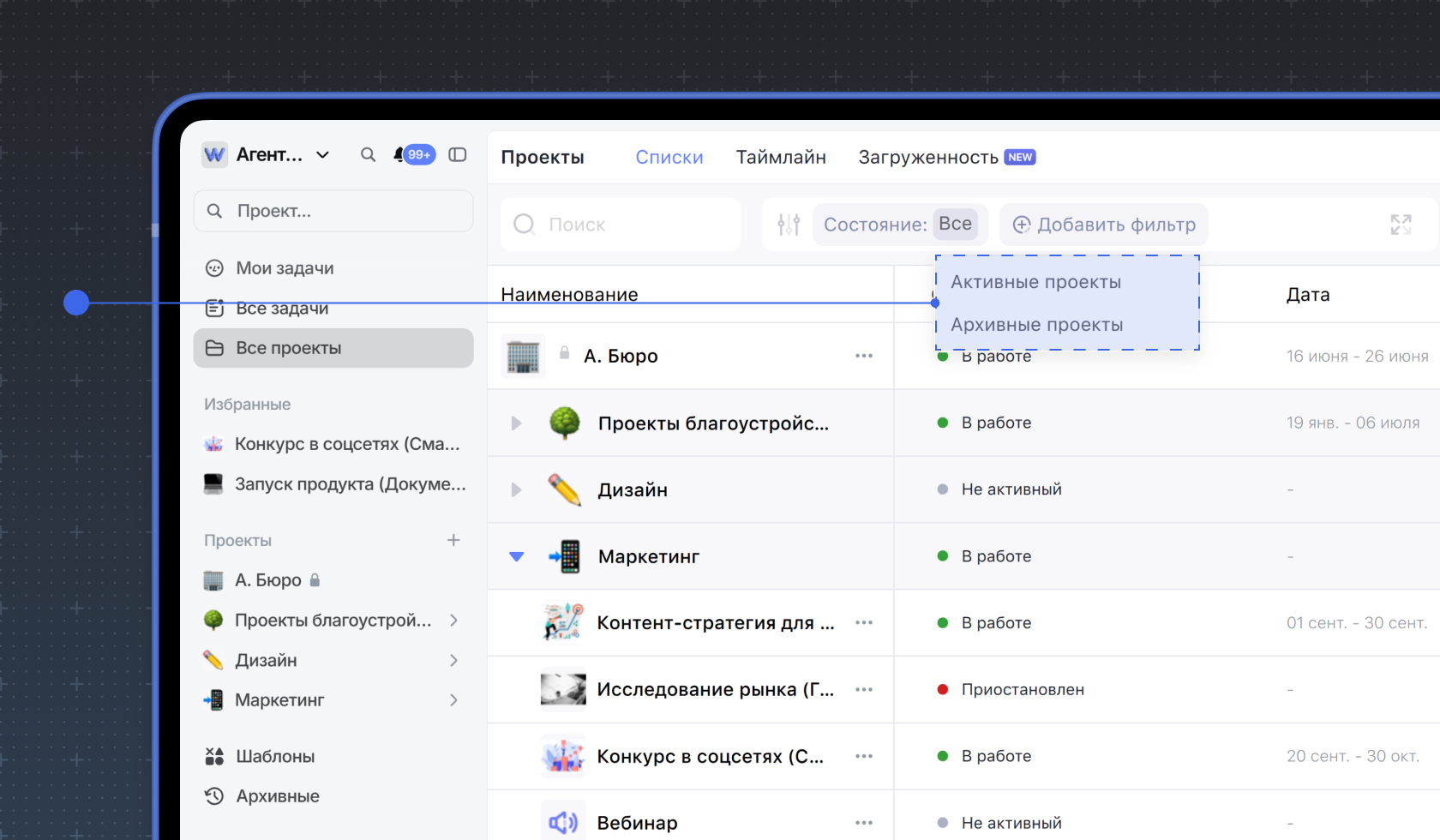 2. Фильтровать проекты по состоянию. Для этого нажмите Добавить фильтр, выберите Состояние и выберите подходящий вариант фильтра