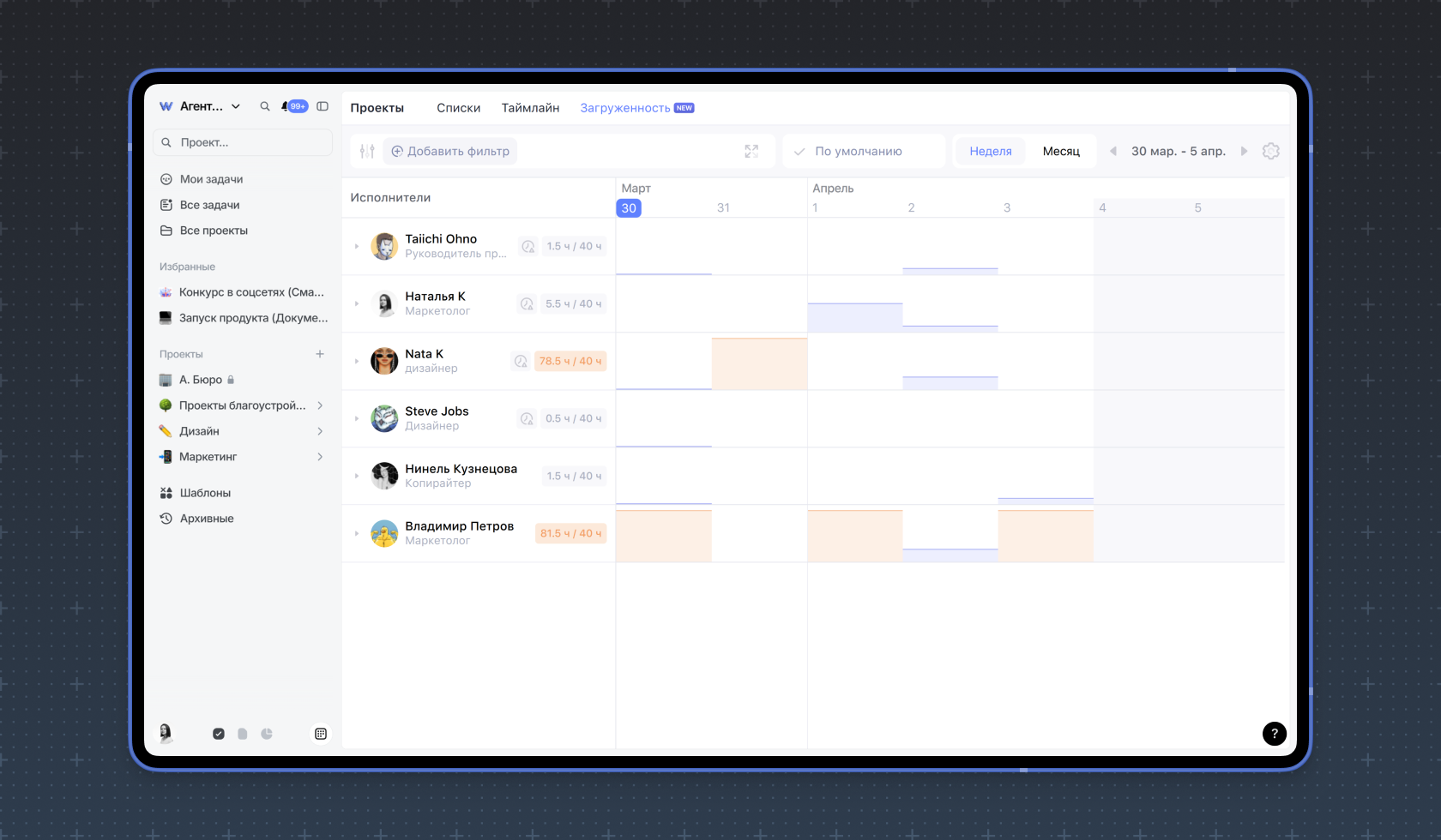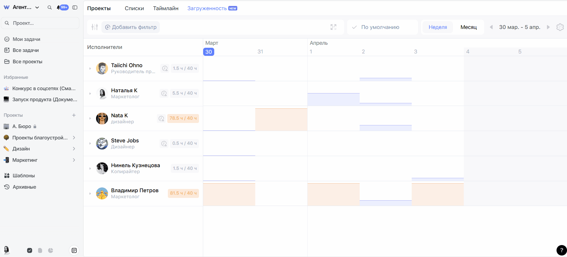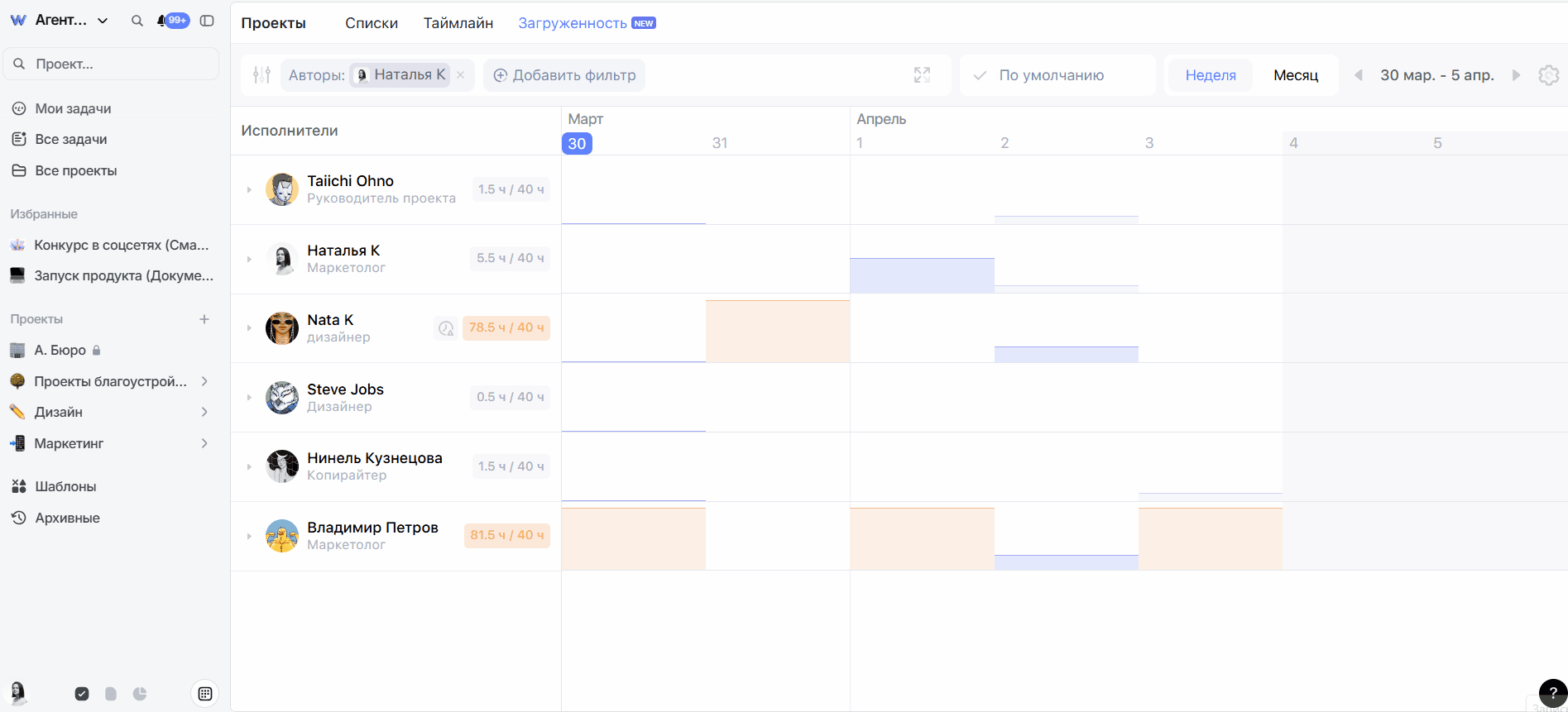 Режим Загруженность показывает, как распределена работа по сотрудникам: сколько часов запланировано и укладываются ли задачи в рабочий график.