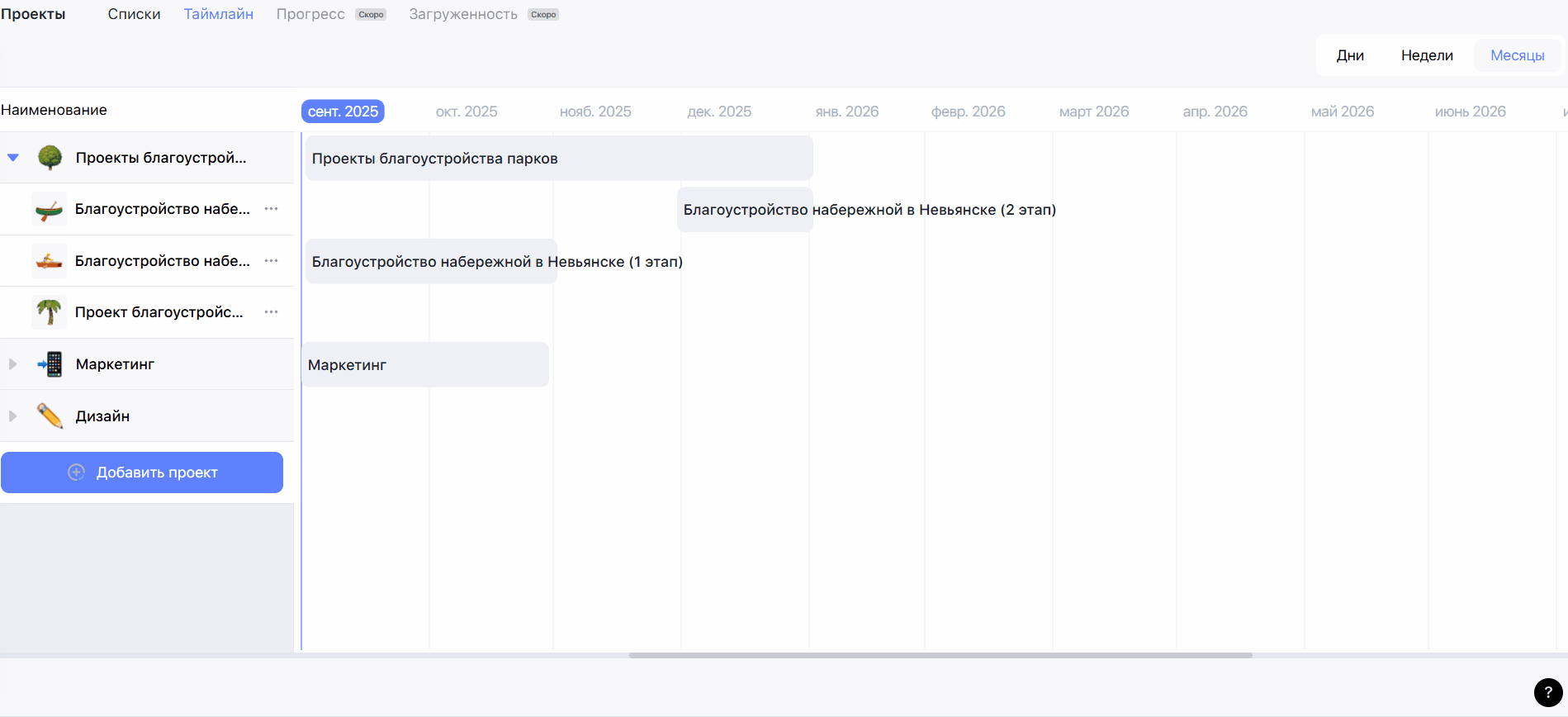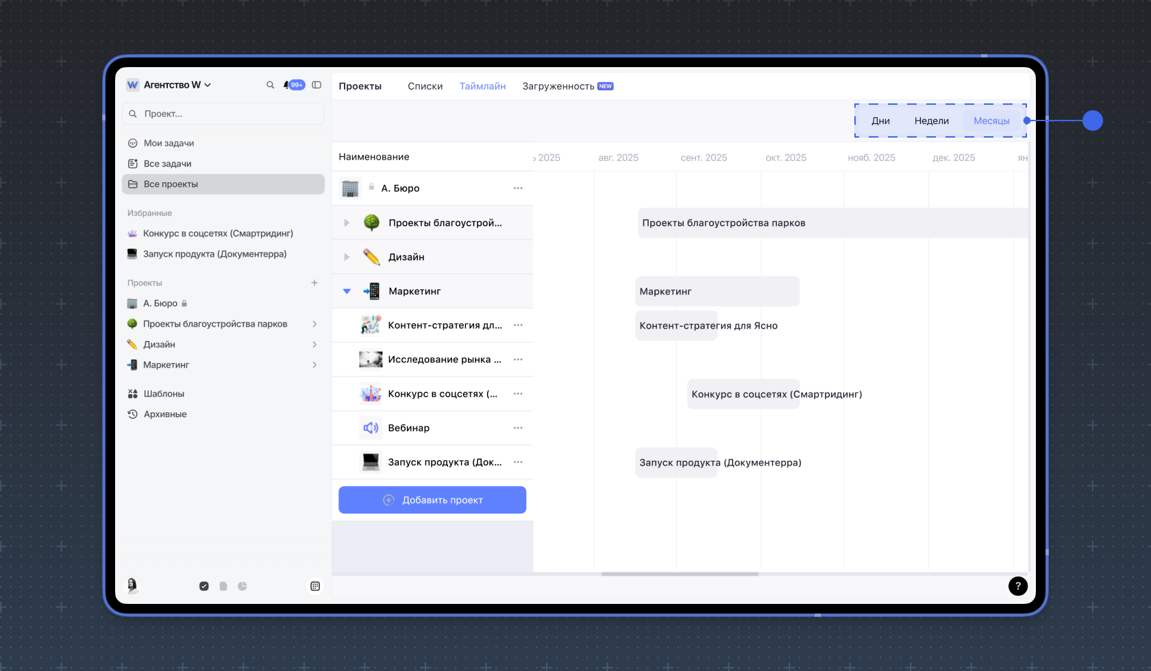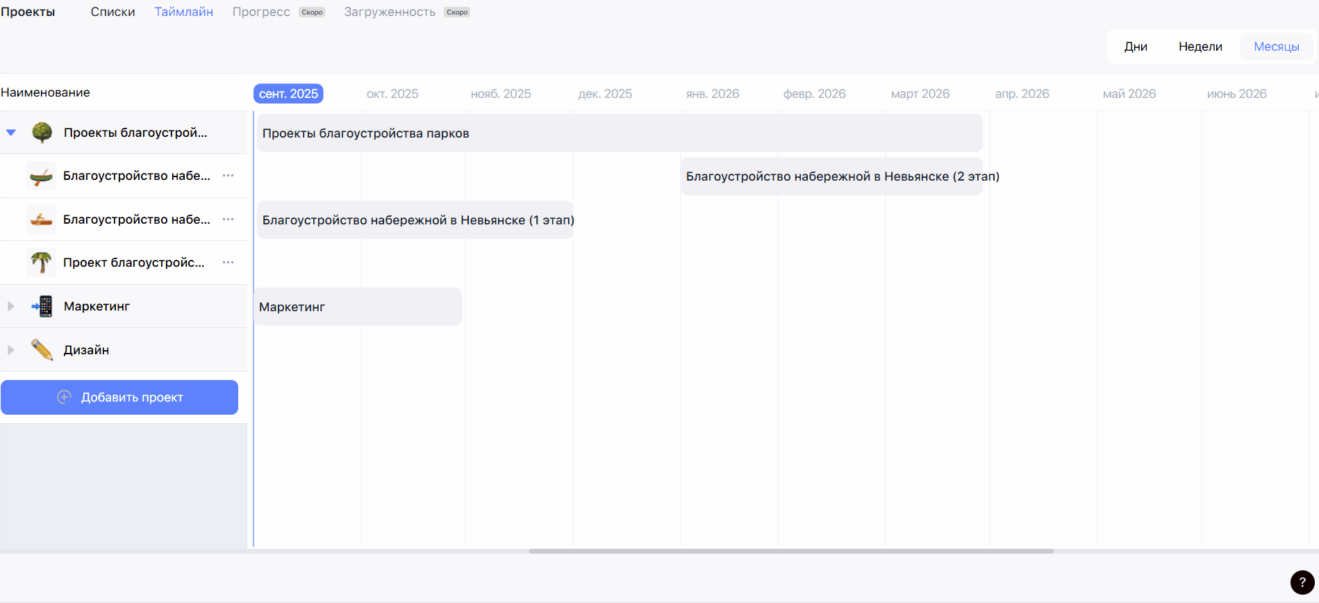 В режиме Таймлайн проекты визуально представлены на временной шкале в соответствии с установленными сроками. Здесь можно менять сроки проектов и зависимости между ними.