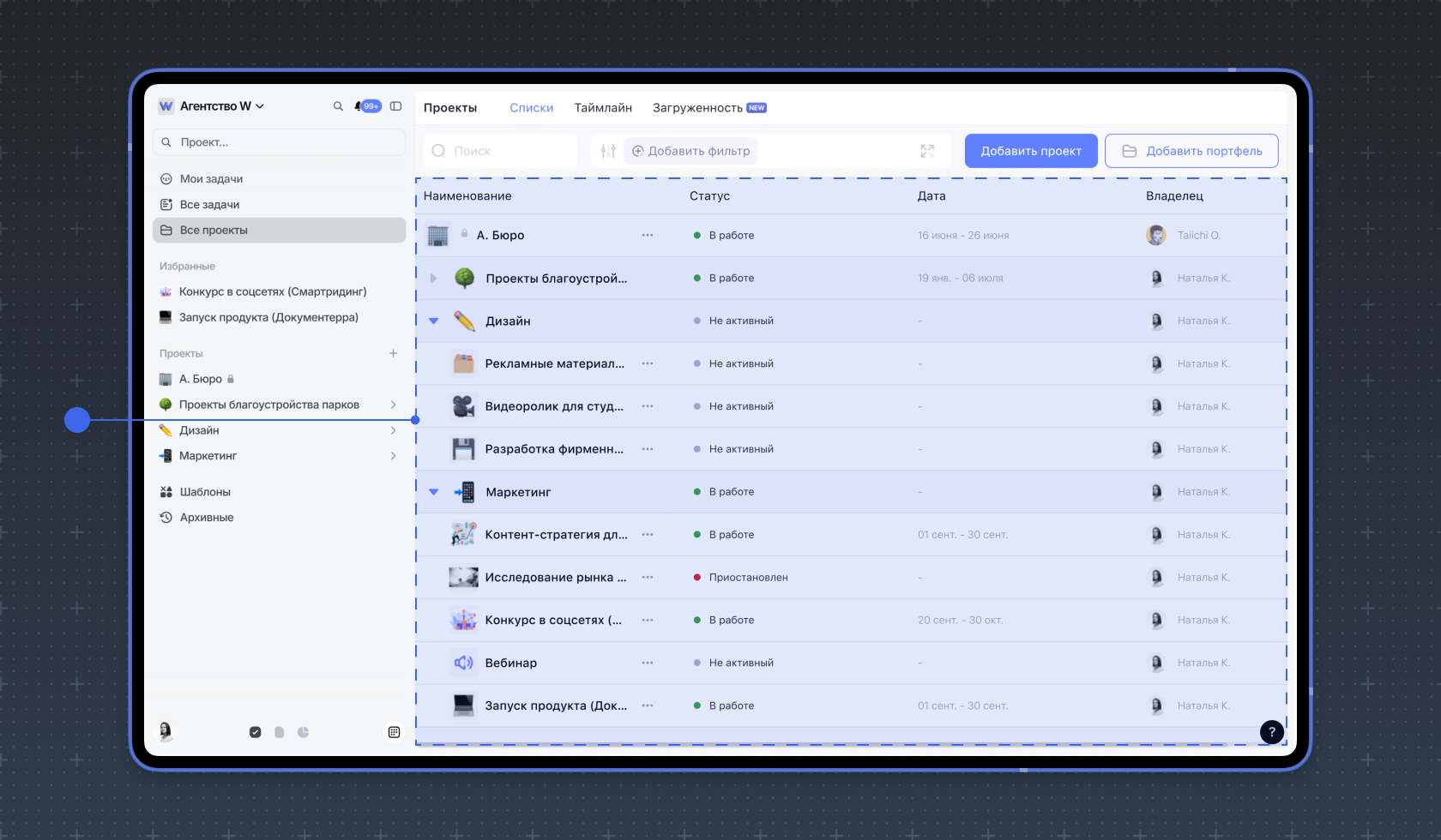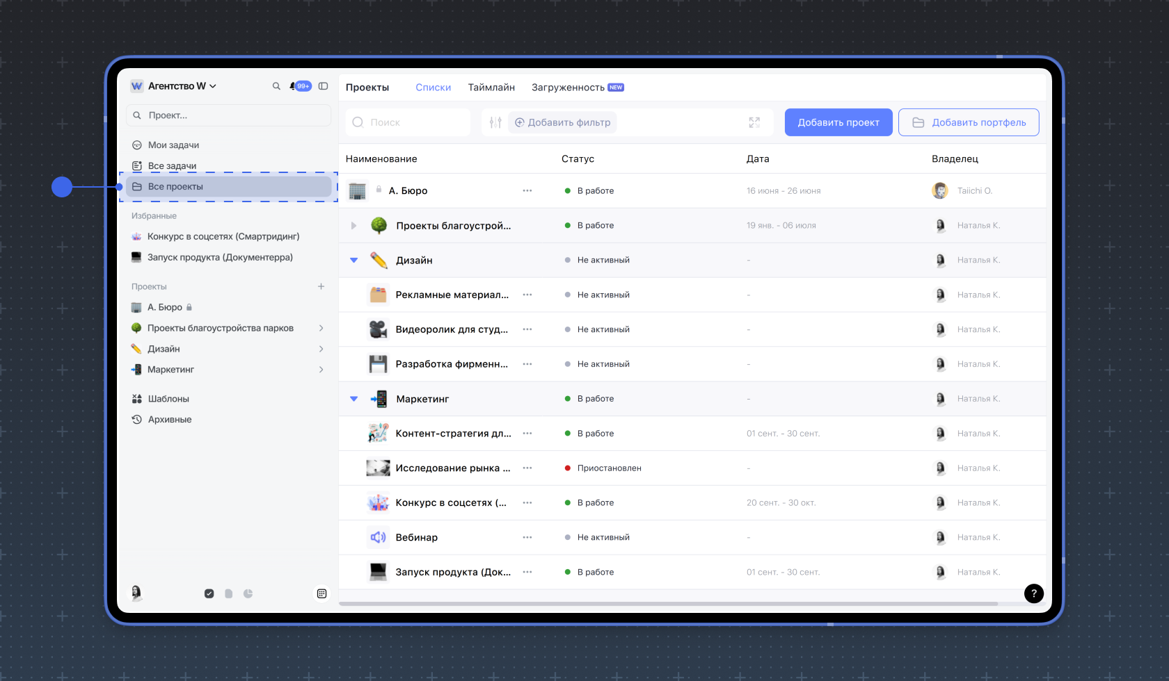В режиме Списки отображаются все проекты, папки и портфели, созданные внутри рабочего пространства и доступные пользователю для просмотра в виде списка. Белым фоном отмечены проекты, серым — папки и портфели. Здесь можно увидеть статус, сроки и владельца проектов и портфелей.