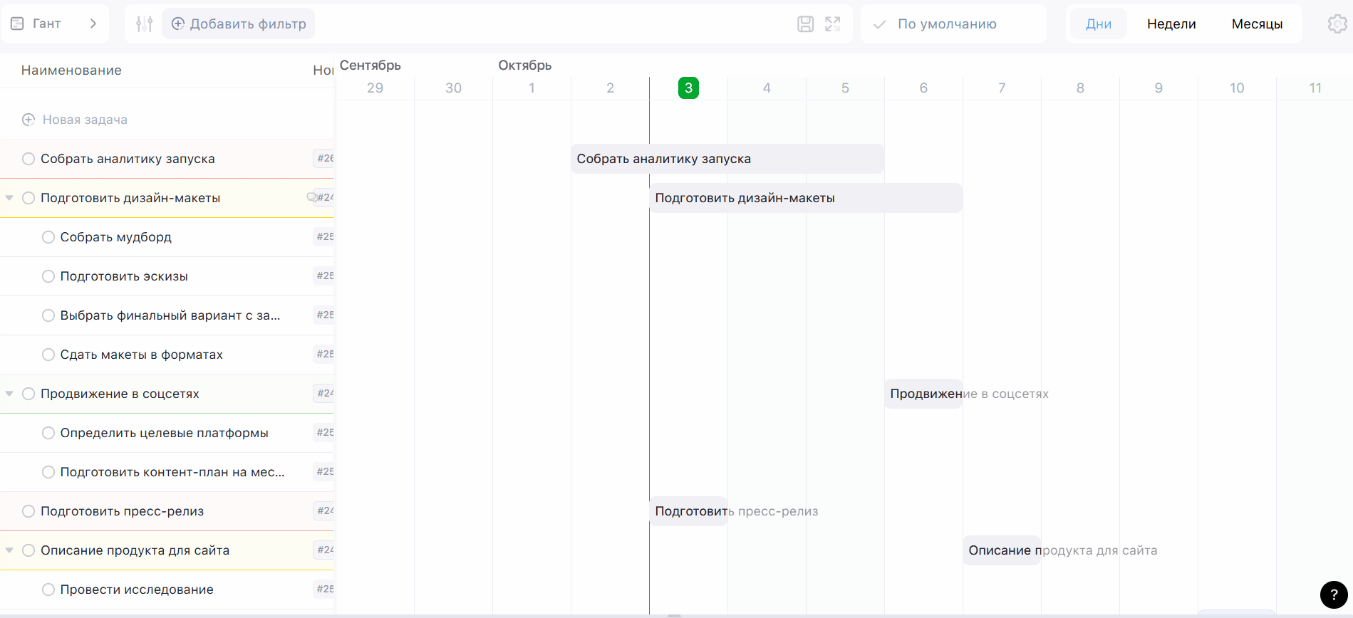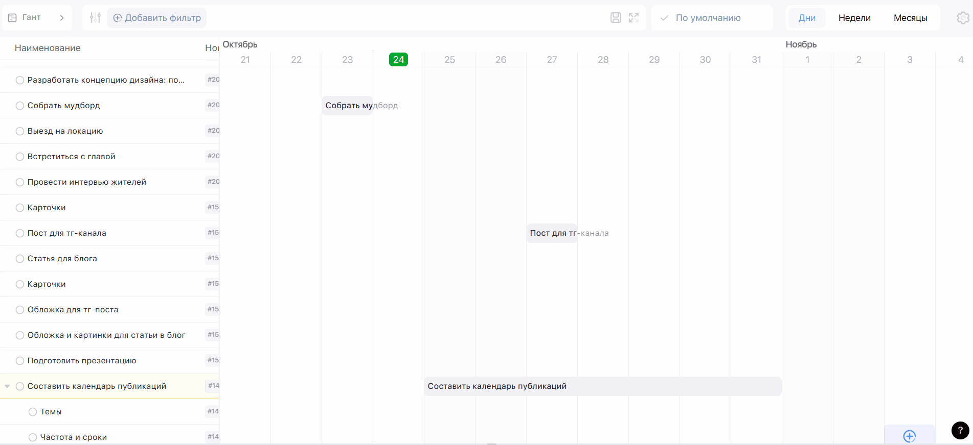 В режиме Гант легко визуально выставлять сроки и длительность задач. Для этого наведите курсор на временную шкалу напротив названия нужной задачи и нажмите на иконку с плюсом.