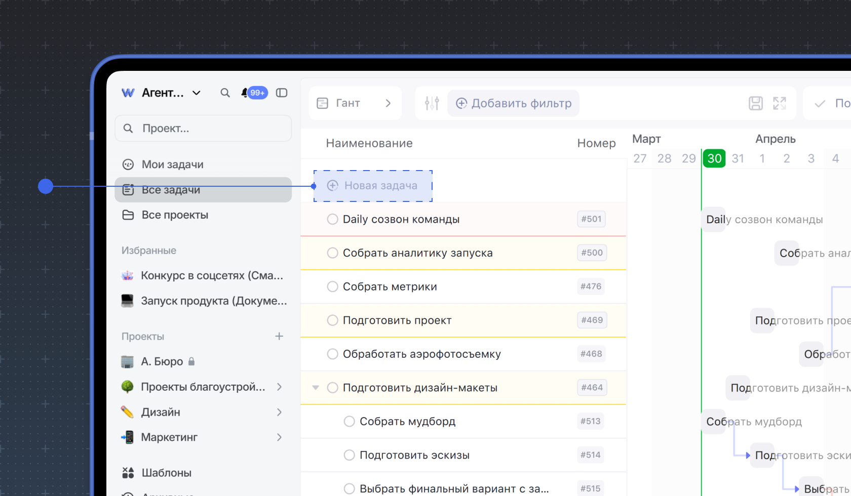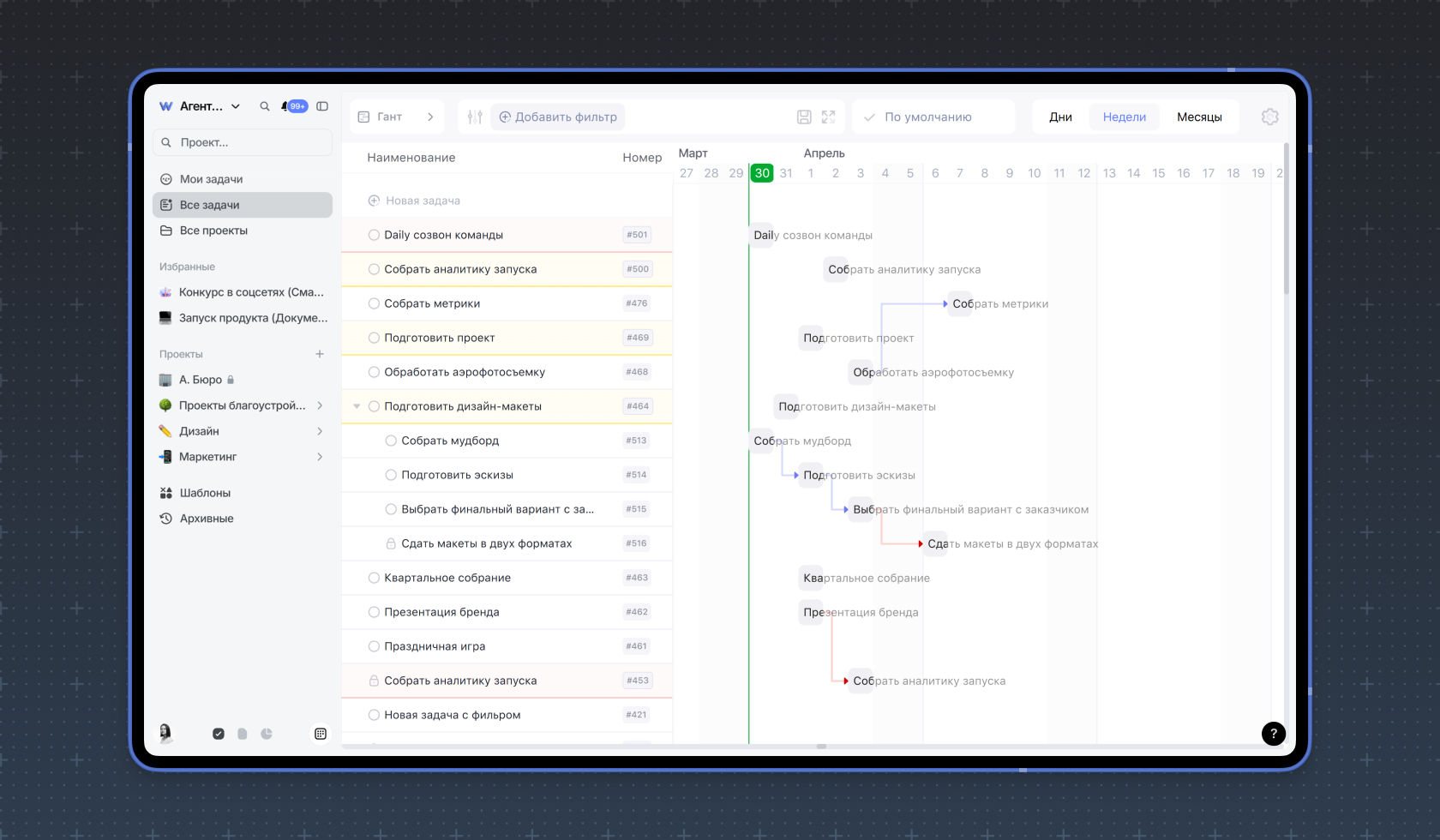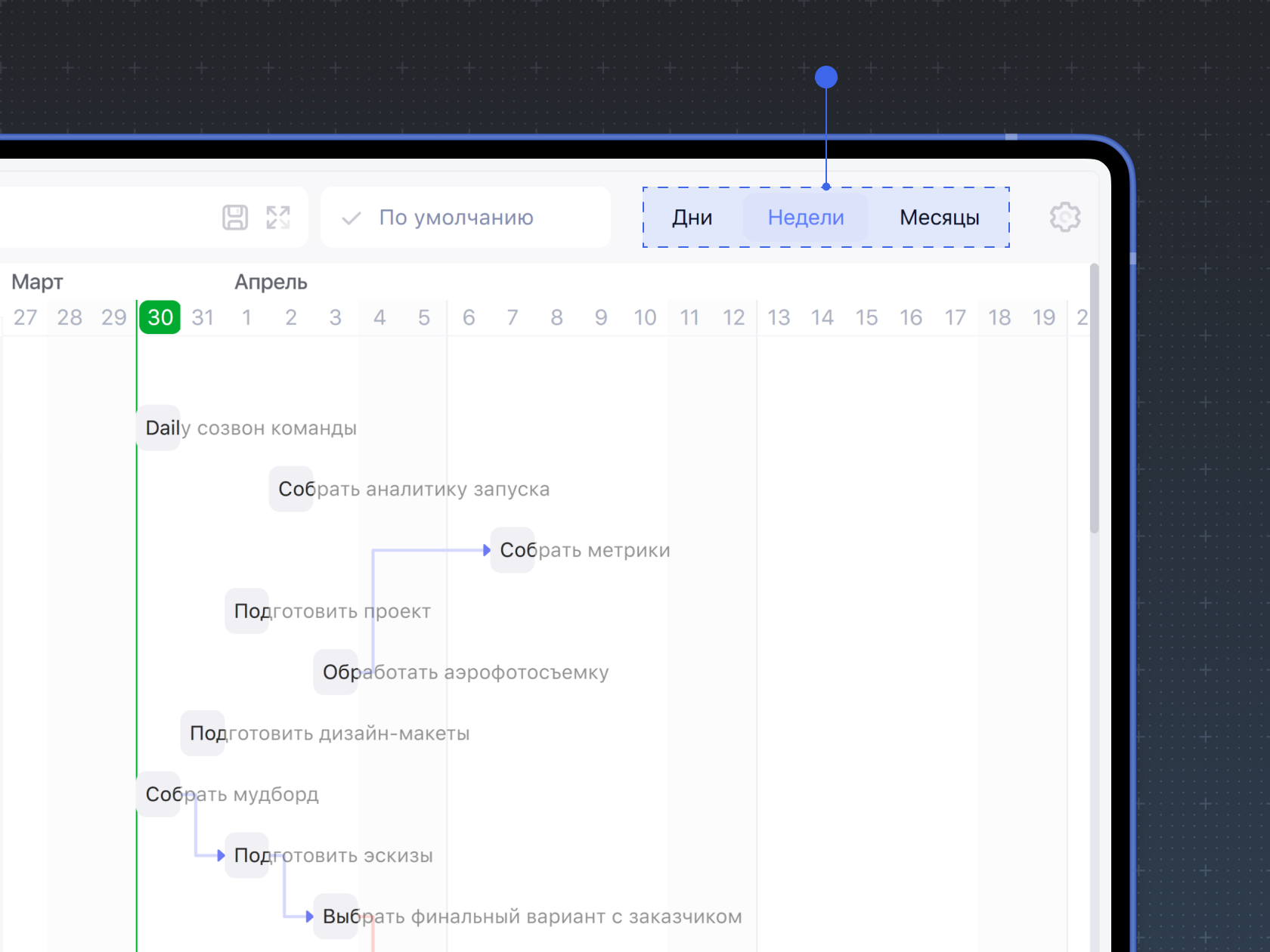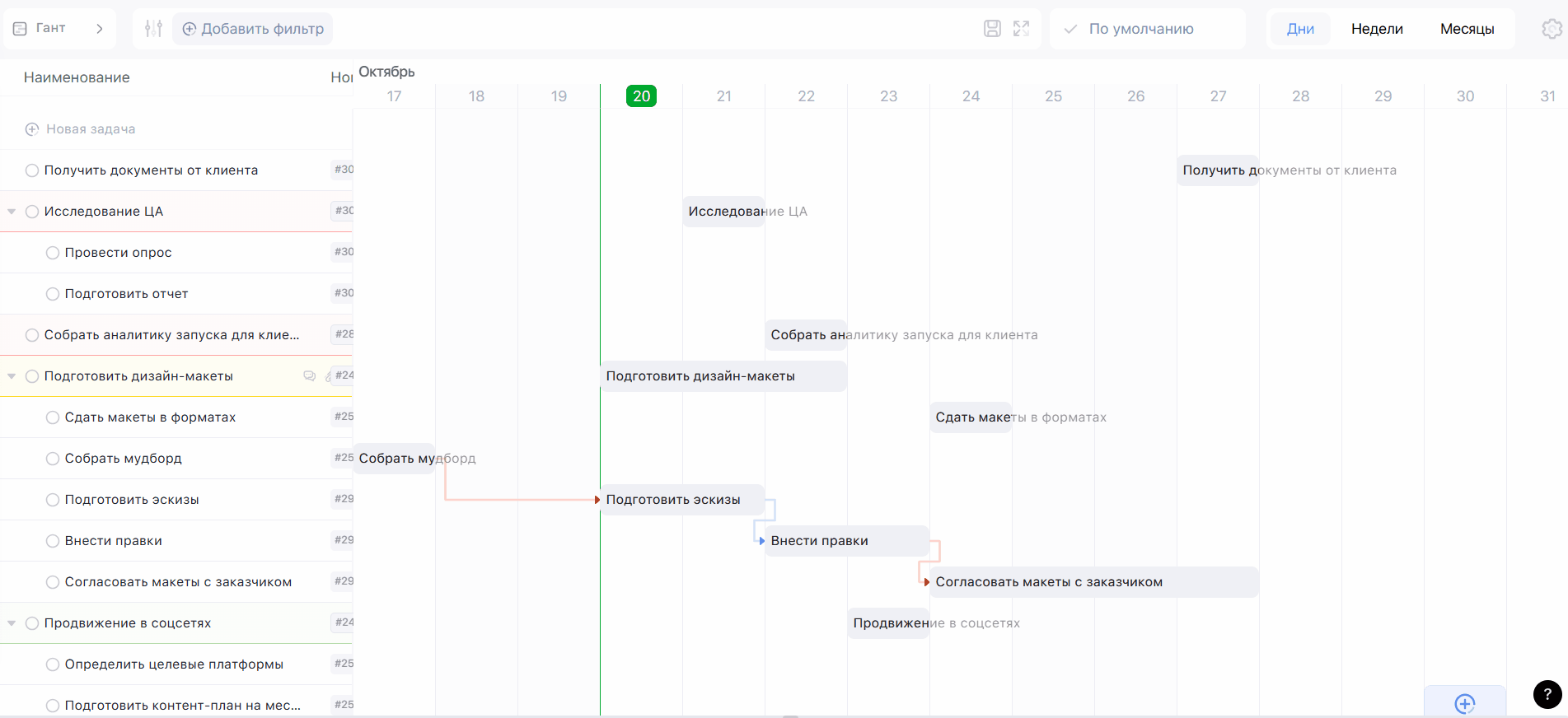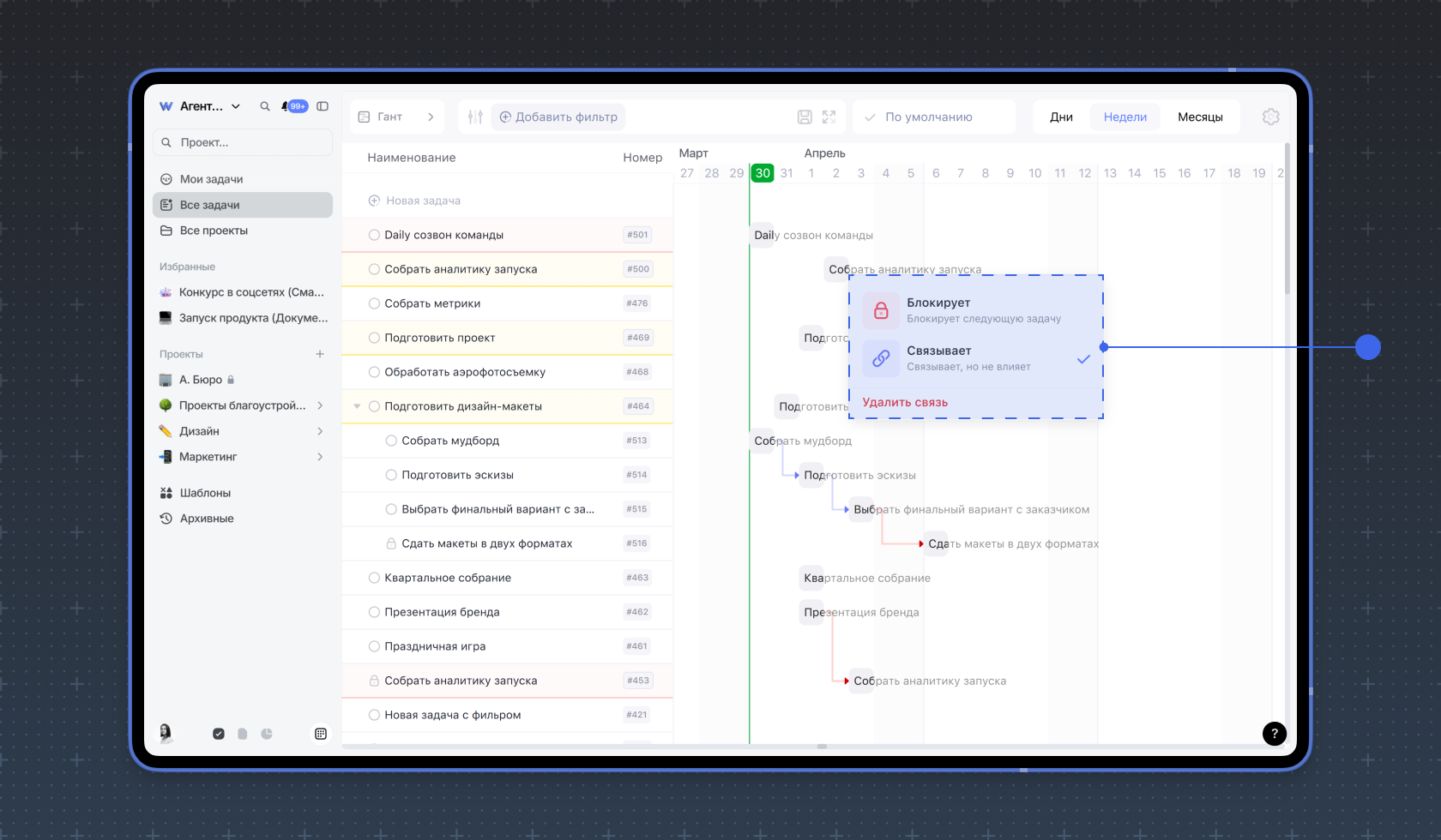 В режиме Гант можно устанавливать последовательность и правила выполнения задач. Для этого настройте связи и зависимости между задачами.