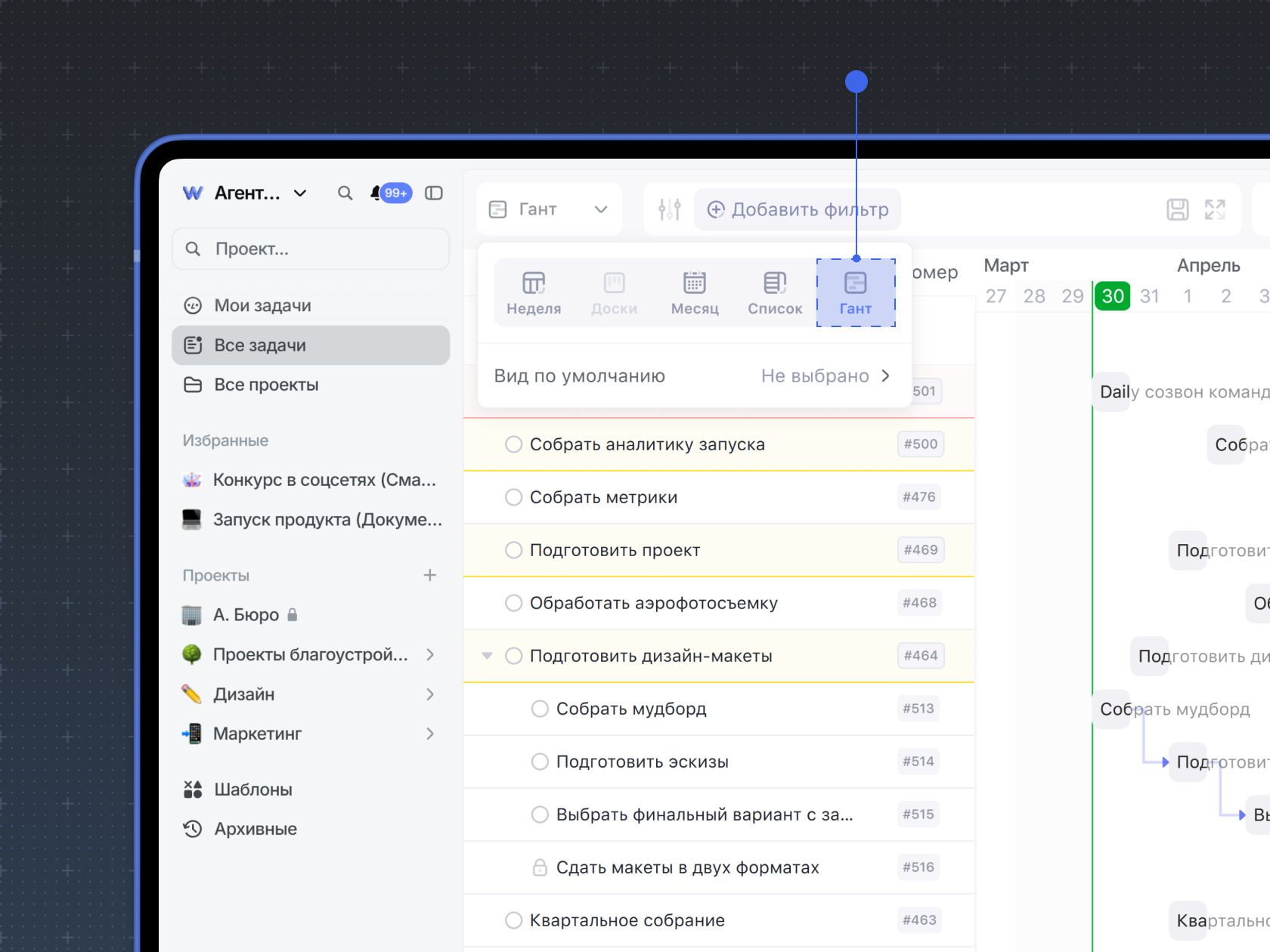 В режиме просмотра Гант можно организовывать работу с помощью диаграммы Ганта — инструмента стратегического планирования. Планируйте долгосрочные проекты, используя зависимости и связи между задачами. Также вы можете оценивать временную нагрузку проектов, команд или отдельных участников с помощью группировки задач и фильтров.